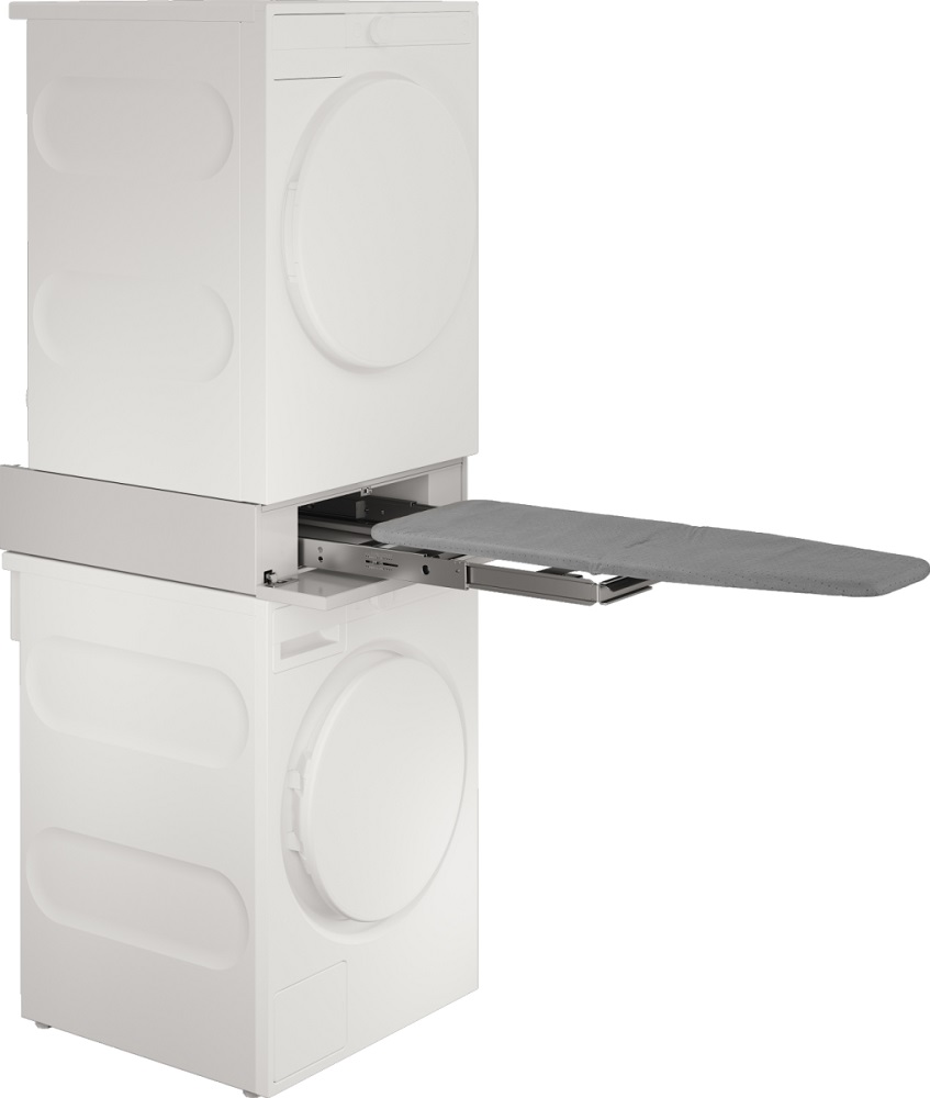 Выдвижная гладильная доска белого цвета устанавливается в колонну между сушильной и стиральной машиной.