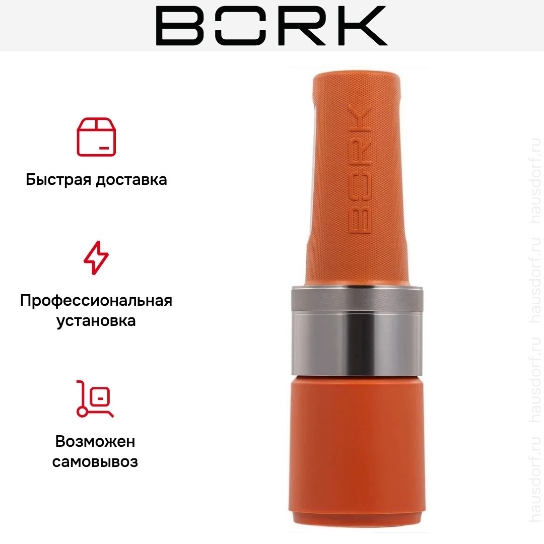 Погружной блендер BORK позволяет готовить смузи, коктейли, смешивать соусы и заправки и многое другое. Такая конструкция требует вашего участия — нужно держать рукоятку с насадкой и контролировать направление движения. Плюс в том, что можно использовать ее прямо в кастрюле, когда готовите, например, суп-пюре. Он может как влиться в общую гамму интерьера, так и стать ярким акцентом; доминирующий цвет — оранжевый.