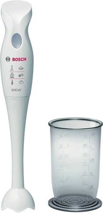 Погружной блендер Bosch позволяет готовить смузи, коктейли, смешивать соусы и заправки и многое другое. Такая конструкция требует вашего участия — нужно держать рукоятку с насадкой и контролировать направление движения. Плюс в том, что можно использовать ее прямо в кастрюле, когда готовите, например, суп-пюре. Корпус сделан в основном из пластика, что уменьшает вес прибора. Он может как влиться в общую гамму интерьера, так и стать ярким акцентом; доминирующий цвет — белый.
