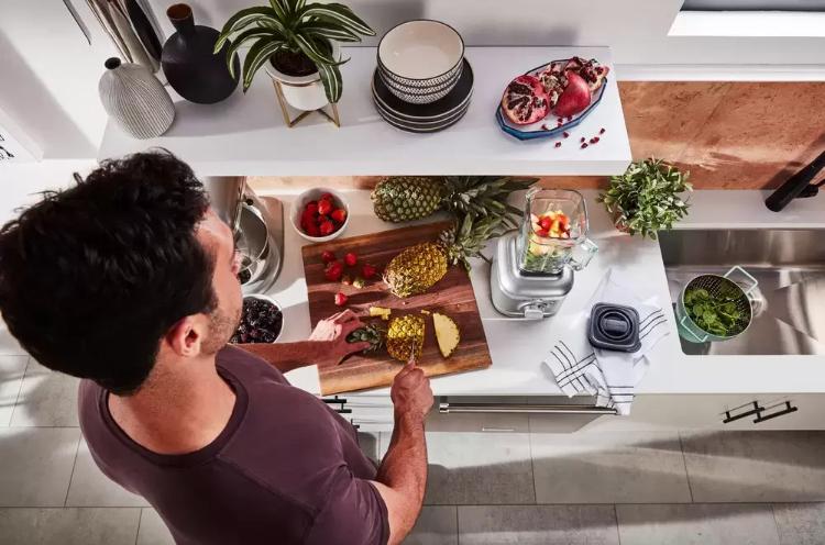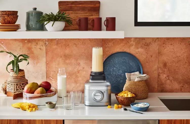 Стационарный блендер KitchenAid позволяет готовить смузи, коктейли, смешивать соусы и заправки, измельчать продукты до состояния пюре и многое другое. Его конструкция подразумевает автономную работу — вам нужно только положить овощи или фрукты и выбрать режим. Он может как влиться в общую гамму интерьера, так и стать ярким акцентом; доминирующий цвет — серебряный медальон.