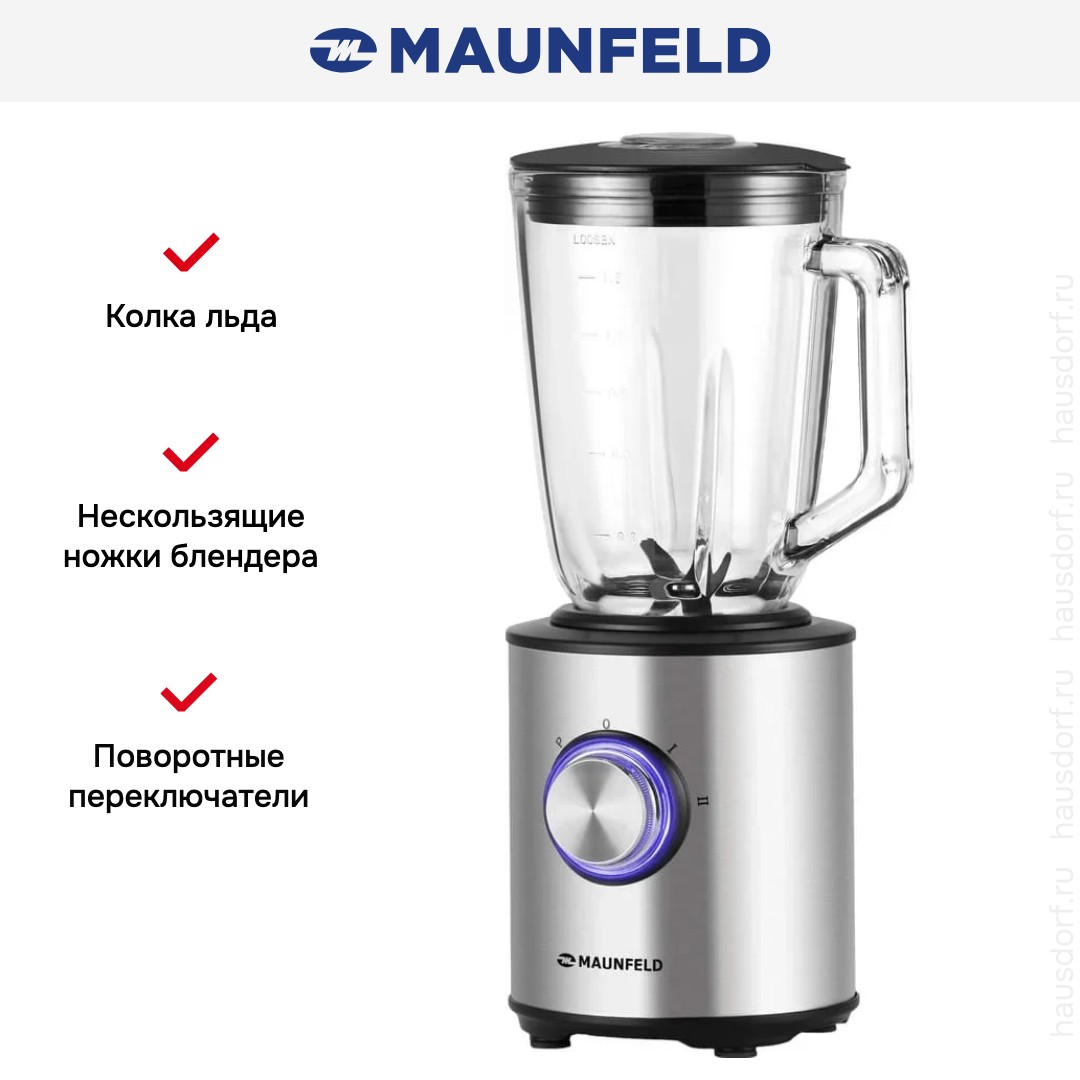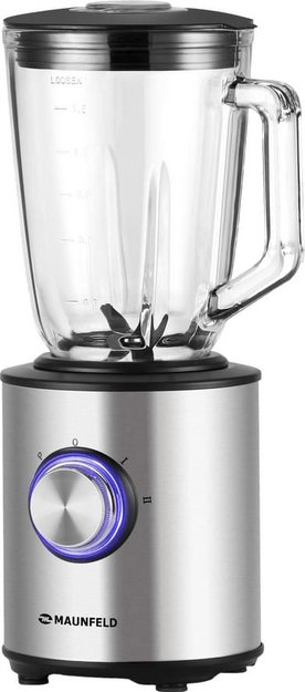 Стационарный блендер Maunfeld позволяет готовить смузи, коктейли, смешивать соусы и заправки, измельчать продукты до состояния пюре и многое другое. Его конструкция подразумевает автономную работу — вам нужно только положить овощи или фрукты и выбрать режим. Корпус сделан в основном из металла, что повышает надежность прибора. Он может как влиться в общую гамму интерьера, так и стать ярким акцентом; доминирующий цвет — нержавеющая сталь. Благодаря специальным нескользящим ножкам блендер сохраняет устойчивость даже на высоких оборотах.
