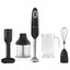 В комплектацию входят измельчитель, насадка для пюре, венчик и чаша на 1,4 л из новейшего материала тритана. Крышка из того же материала. Чаша промаркирована в литрах и унциях, имеет удобную и эргономичную ручку. Насадка для пюре включает в себя пластиковый корпус и такие же ножи с технологией для давления овощей и фруктов в пюре. Венчик подсоединяется к блендеру с помощью адаптера. Его также можно мыть в посудомоечной машине.
