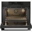 Верхняя панель управления с двумя поворотными переключателями, сенсорными кнопками и большим TFT-дисплеем обеспечивает простую регулировку параметров приготовления и может блокироваться от детей. Откидная дверца с тремя слоями стекла может сниматься для самой тщательной очистки. Для плавного открывания и закрывания дверца оборудована доводчиком. Два противня, решетка и съемные направляющие входят в комплект. Для удаления загрязнений со стенок камеры служит паровая очистка и покрытие из пиролитической эмали. Модель отличается экономичностью: ей присвоен высокий класс знергопотребления А+.