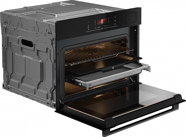 Особенности дизайна и внешней панели управления — также важный пункт при выборе духовки на кухню. В данной модели нужно обратить внимание на цвет — черное стекло, охлаждение двери, чтобы поверхность и мебель вокруг не нагревались.