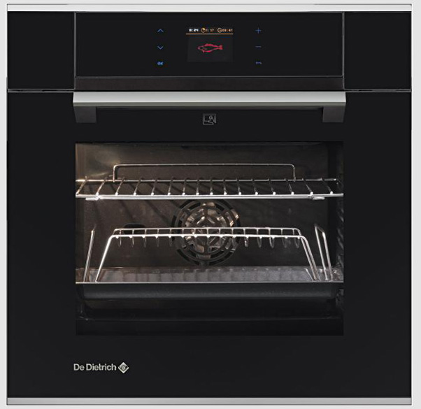 Управление De Dietrich DOP792B осуществляется с помощью сенсорной, цветной TFT панели Color Matrics. Она может выдвигаться под углом, что делает работу с экраном легче и удобнее. На дисплее отражается меню управления, время, данные о процессе приготовления и параметрах внутренней камеры духовки.