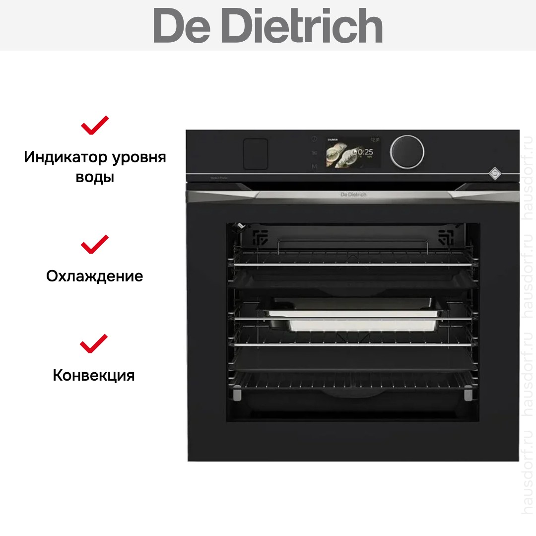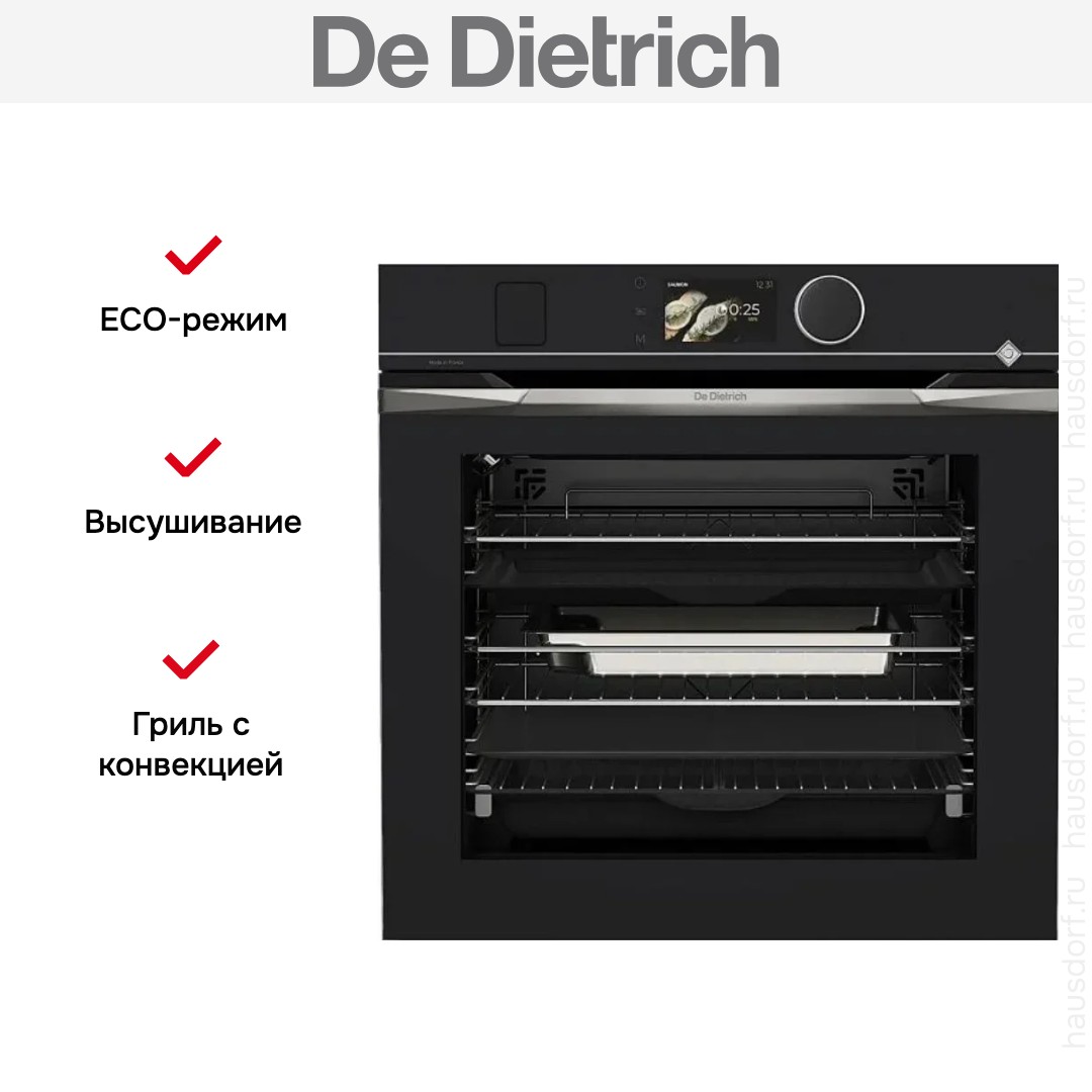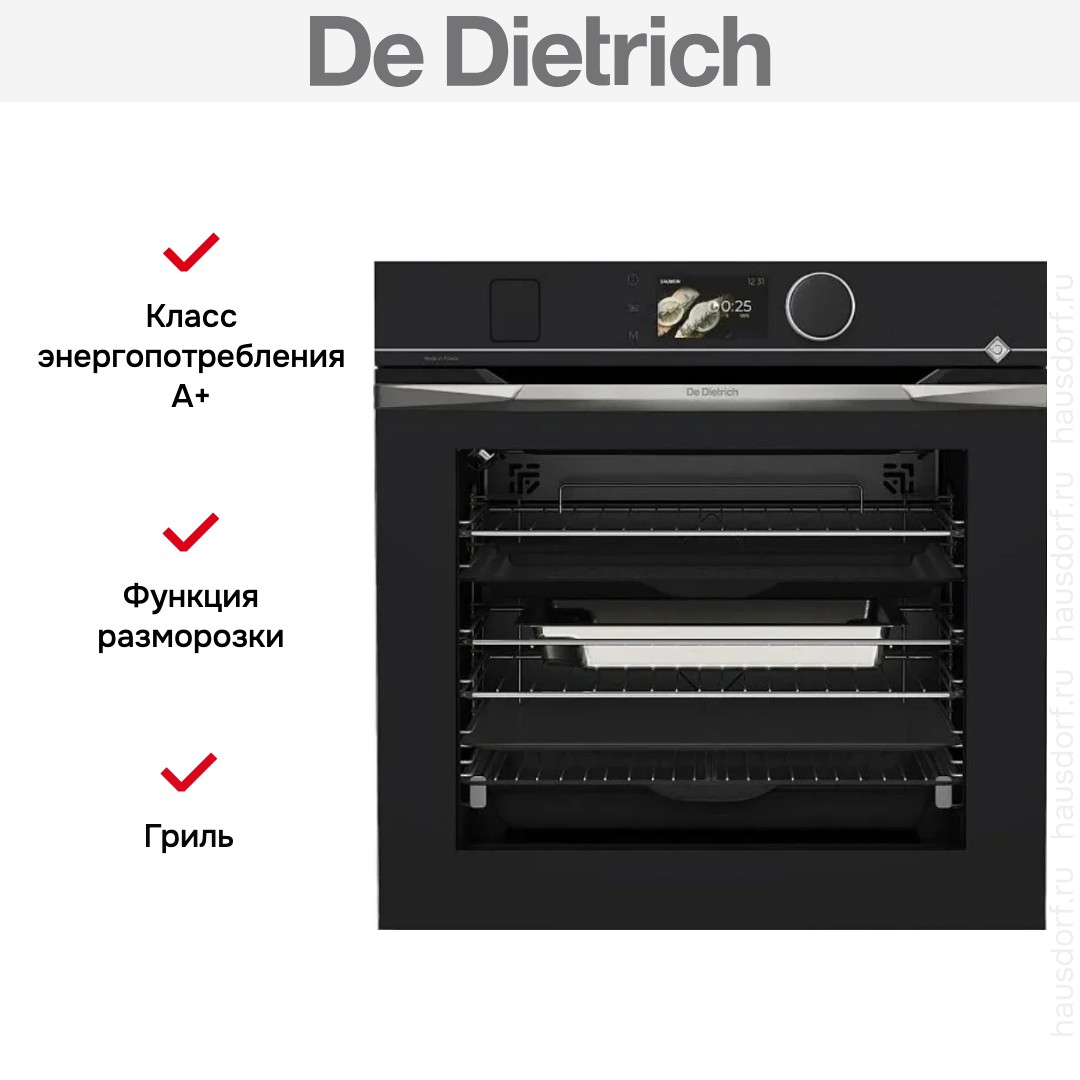 Количество режимов работы в духовом шкафу Де Дитрих: 24. В число доступных программ входят: классический нагрев, конвекция, дополнительное использование пара, гриль для создания хрустящей корочки, сушка для овощей и фруктов, и другие. Помимо основных программ воспользуйтесь специальными возможностями этого прибора: размораживанием продуктов, чтобы сократить время на подготовку; и другими. Тип гриля в этой модели — электрический.