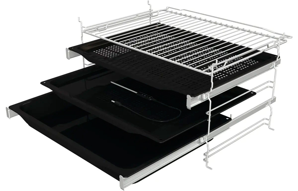 В стандартную комплектацию любого духового шкафа входят один или два противня — эмалированных или с антипригарным покрытием — и решетка. Единственный противень, как правило, имеет низкие бортики и предназначается для приготовления выпечки. Если духовка комплектуется двумя противнями, то второй отличается более высокими бортиками — его можно использовать для запекания мяса, птицы, овощных блюд. На решетке в духовке, не оснащенной грилем, обычно устанавливаются формы для запекания — стальные, керамические или стеклянные. В духовках премиум-класса количество противней может быть увеличено: к стандартному комплекту добавляются противни с перфорацией для мяса, специальные поддоны для сбора выделившегося сока.