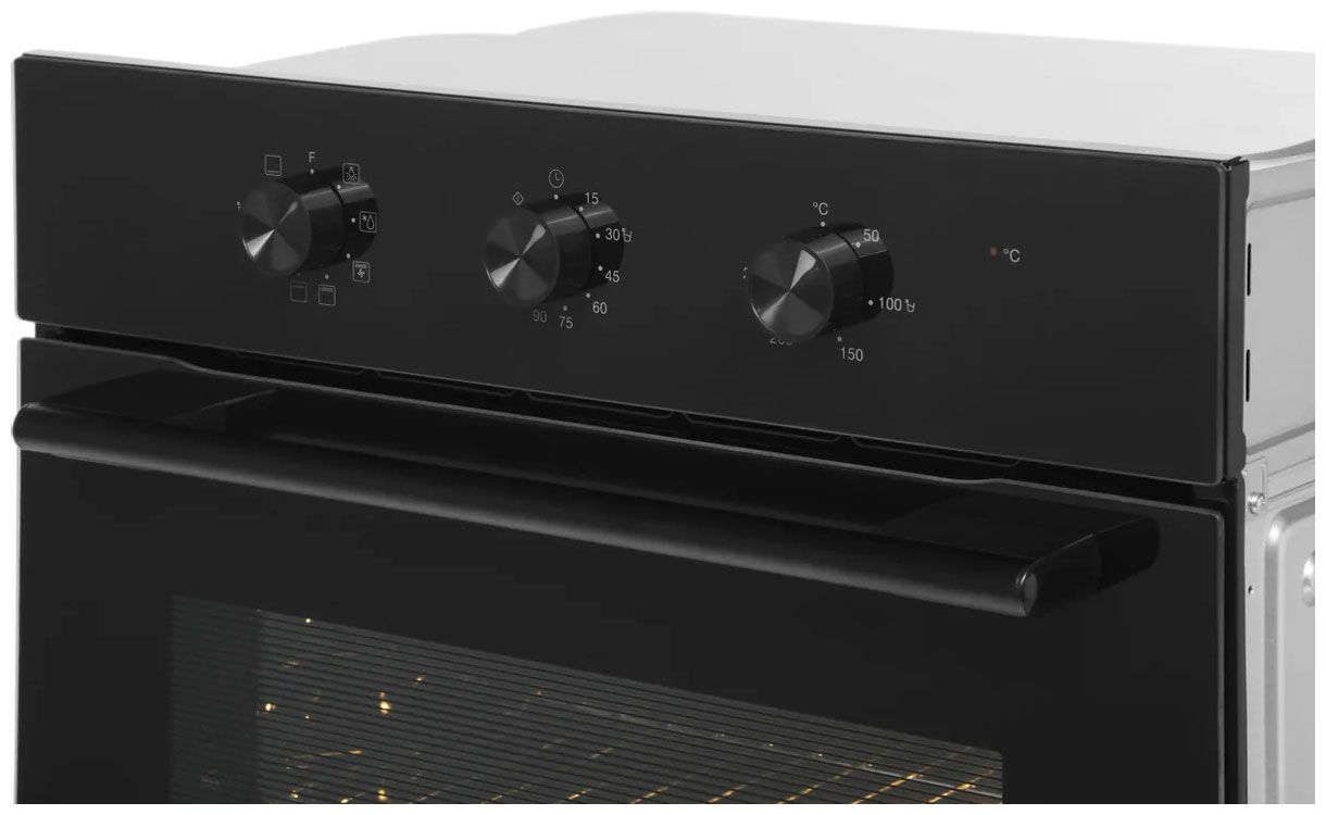 Особенности дизайна и внешней панели управления — также важный пункт при выборе духовки на кухню. В данной модели нужно обратить внимание на цвет — черный, Механическая панель управления позволяет быстро разобраться в настройке программ и не требует чрезмерных усилий.