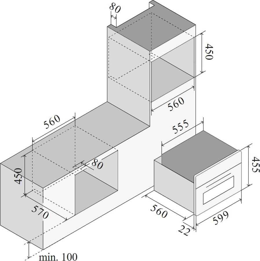 Глубина духовых шкафов, в отличие от их высоты и ширины, не отличается разнообразием. Стандартное значение составляет 54-55 см, что позволяет встраивать устройство в обычную кухонную тумбу или колонну глубиной 60 см так, чтобы оставалось достаточно места до задней стенки мебели или стены кухни для обеспечения нормальной вентиляции. В инструкциях по установке указывается, что это расстояние должно составить не менее 4–5 см. Объем такой духовки может быть равен от 50 до 70 литров.