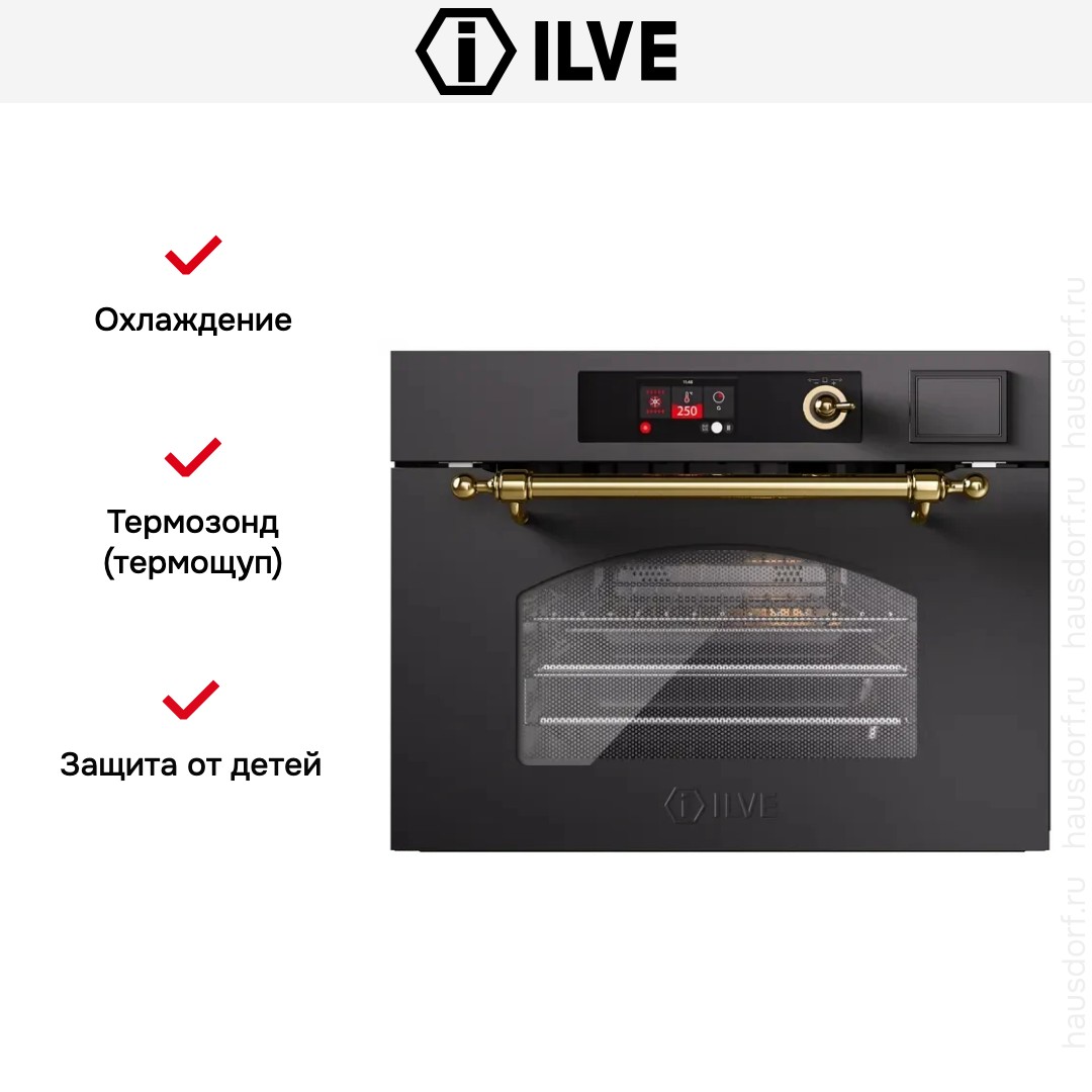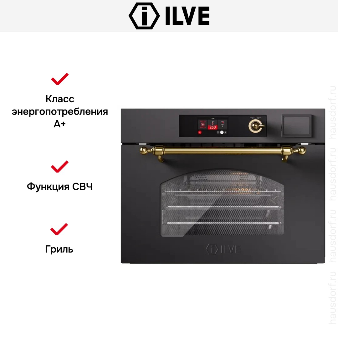 Количество режимов работы в духовом шкафу Илве: 10. В число доступных программ входят: конвекция, приготовление с помощью микроволн, дополнительное использование пара, гриль для создания хрустящей корочки, и другие. Тип гриля в этой модели — электрический.