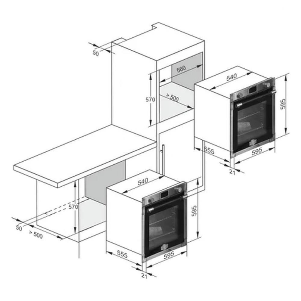 Габариты прибора — 59,4 см в высоту и ширину при глубине 54,3 см — соответствуют классическим размерам встраиваемой техники, при этом его конструкция отличается продуманной компактностью. Для корректной установки требуется ниша габаритами 55,8×56,7×53 см, что гарантирует плотное прилегание, аккуратный внешний вид и эффективную вентиляцию корпуса. Такая точность в проектировании способствует снижению тепловых нагрузок и продлевает срок службы устройства.