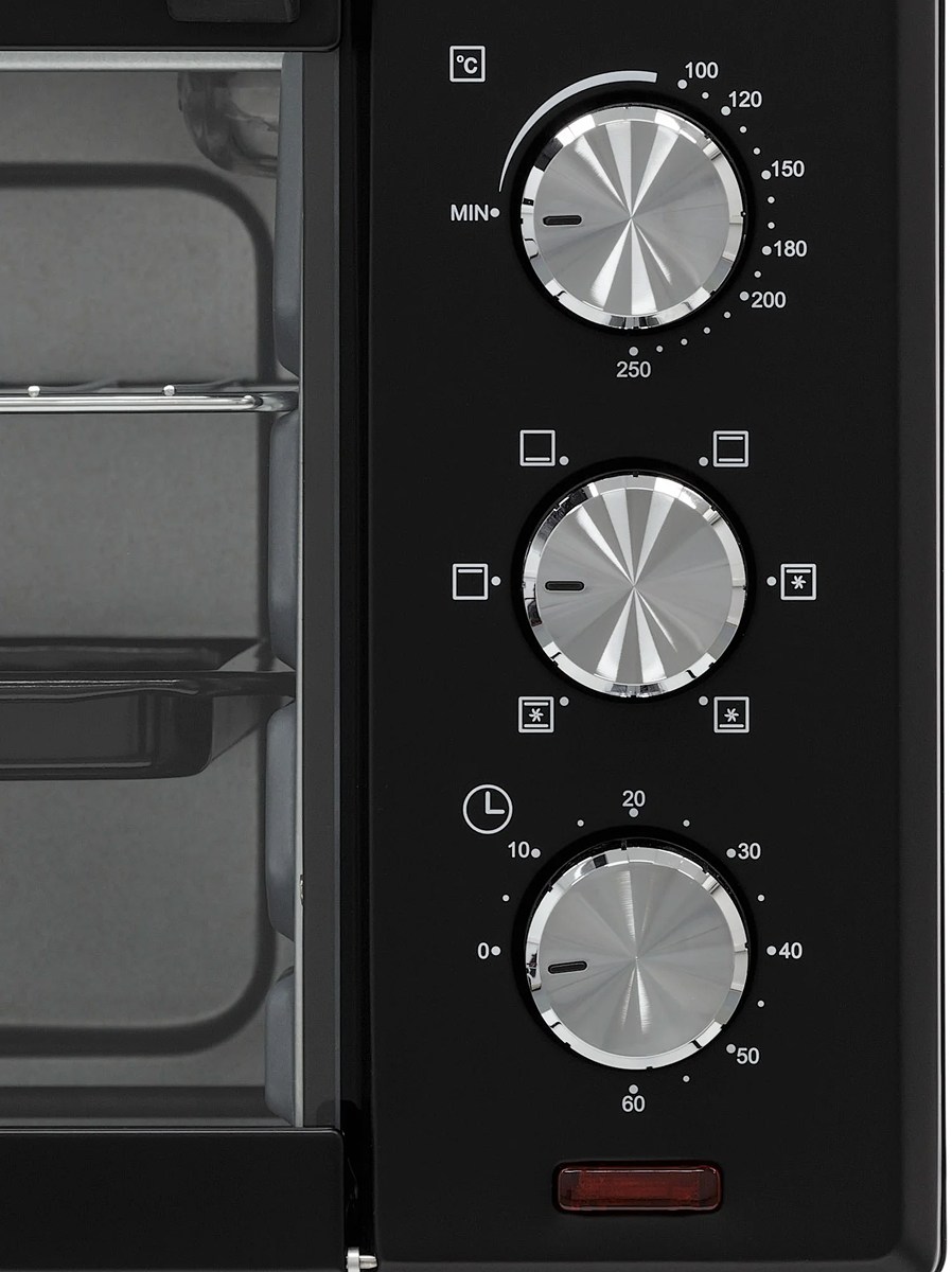 Особенности дизайна и внешней панели управления — также важный пункт при выборе духовки на кухню. В данной модели нужно обратить внимание на цвет — черный, Механическая панель управления позволяет быстро разобраться в настройке программ и не требует чрезмерных усилий.