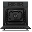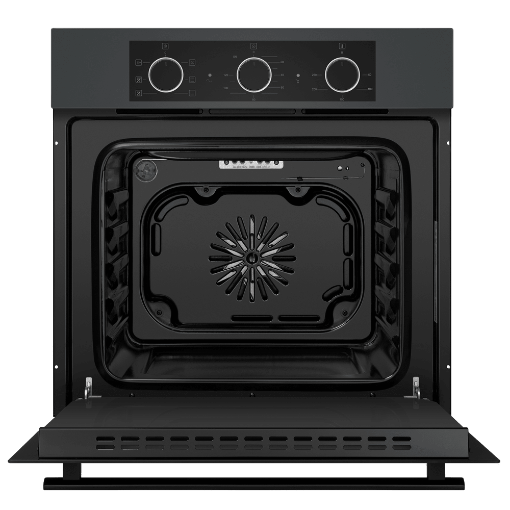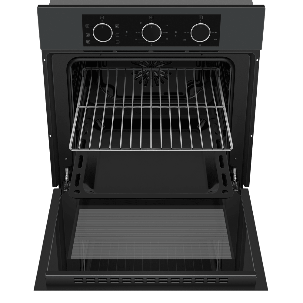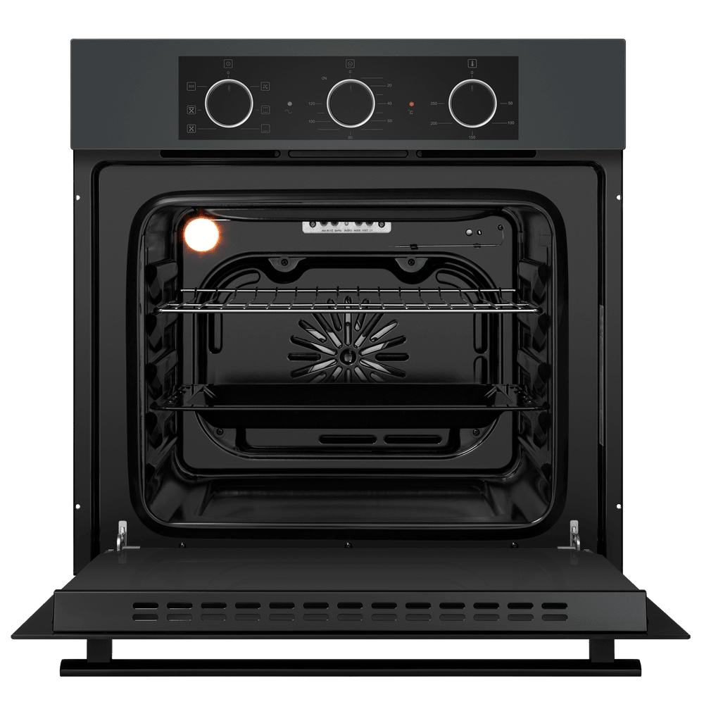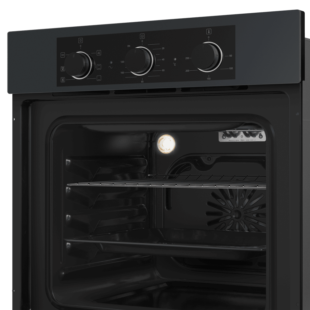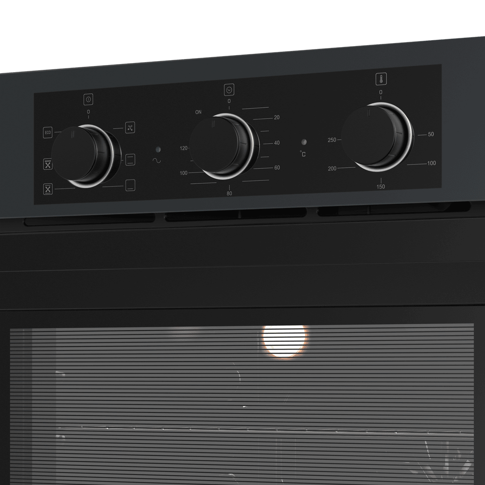 Эта встраиваемая электрическая печь выглядит сдержанно и современно: строгая плоская панель с черной фурнитурой, затемненное трехслойное стекло в дверце и поворотные рукояти с серебристой окантовкой создают деловой и спокойный образ, который не перетягивает внимание на себя, но задаёт тон. Откидная дверь открывается плавно, внутри видна объемная камера с гладким эмалированным покрытием, отражающим свет и упрощающим уход после готовки.