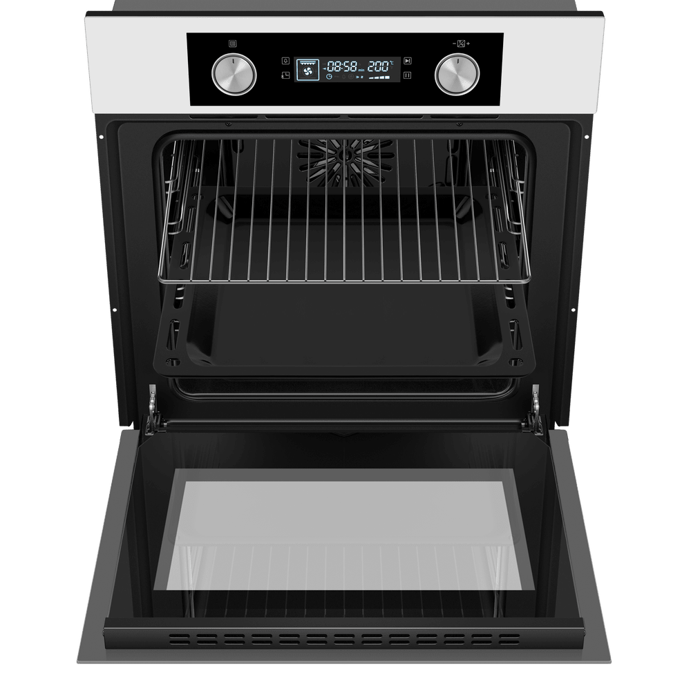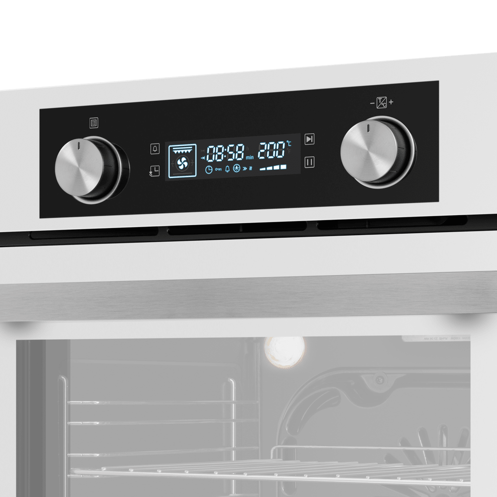 Внешне прибор выделяется лаконичным белым корпусом с эстетичными элементами из нержавеющей стали. Откидная дверца с тремя защитными стеклами придает блеска и аккуратности внешнему виду, а утопленные поворотные регуляторы вместе с сенсорными кнопками образуют информативную панель управления с дисплеем. Такое сочетание материалов и технологий легко впишется в интерьеры, близкие к минимализму, скандинавскому или современному классицизму, где требуется нейтральный, но выразительный акцент.