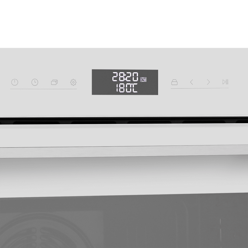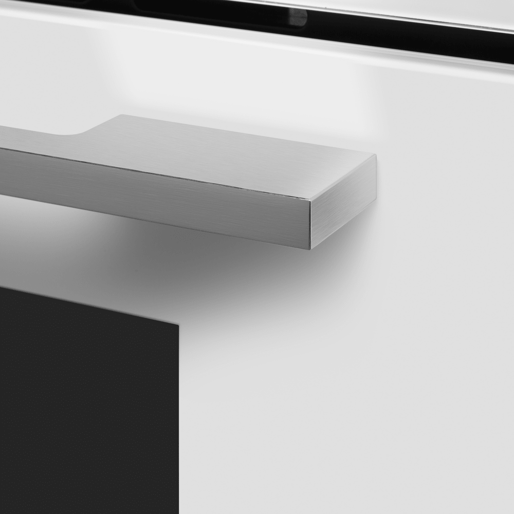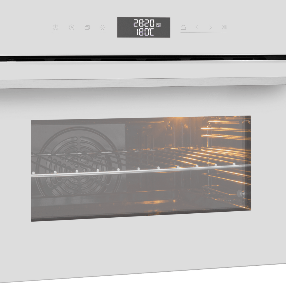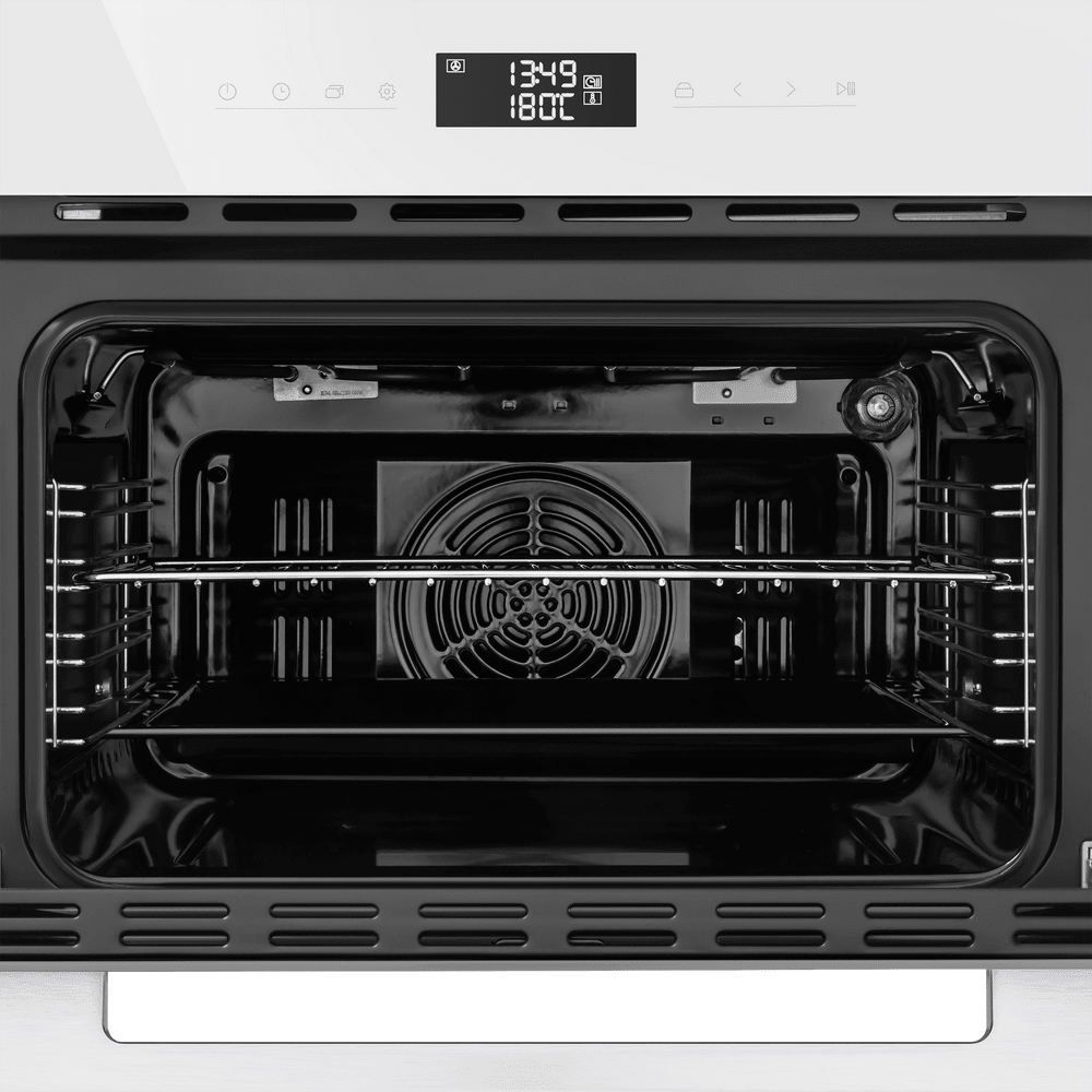 Элегантная белая фронтальная панель с фурнитурой из нержавеющей стали задаёт тон простой, но выразительной эстетике. Поверхность спокойного оттенка гармонирует с различными фактурами, а хромированный ободок ручки подчёркивает современность дизайна. Откидная дверца с трёхслойным остеклением выглядит лёгкой и монолитной одновременно, внешняя поверхность остаётся прохладной во время работы, что повышает комфорт при использовании.