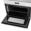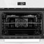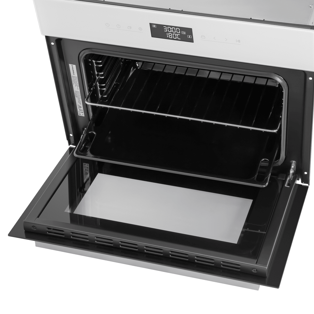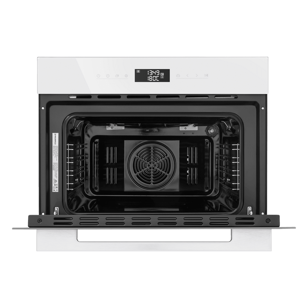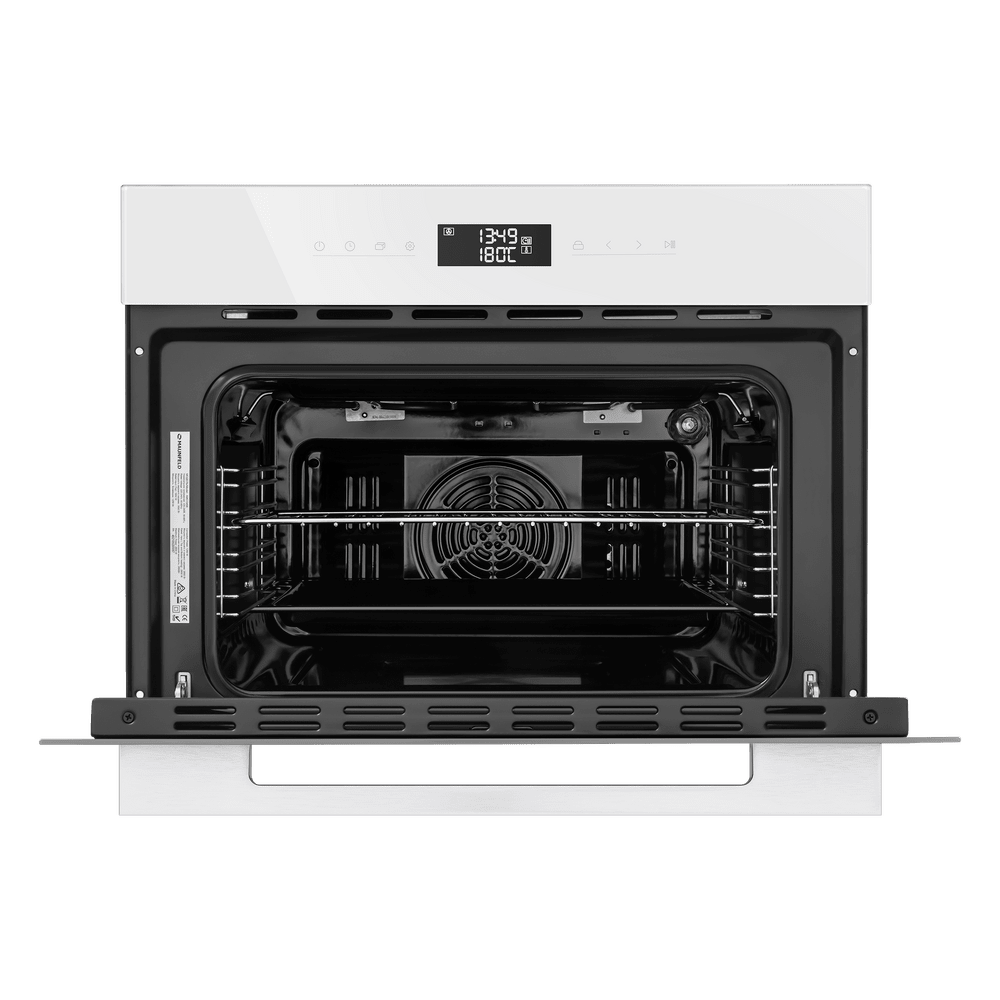Элегантная белая фронтальная панель с фурнитурой из нержавеющей стали задаёт тон простой, но выразительной эстетике. Поверхность спокойного оттенка гармонирует с различными фактурами, а хромированный ободок ручки подчёркивает современность дизайна. Откидная дверца с трёхслойным остеклением выглядит лёгкой и монолитной одновременно, внешняя поверхность остаётся прохладной во время работы, что повышает комфорт при использовании.