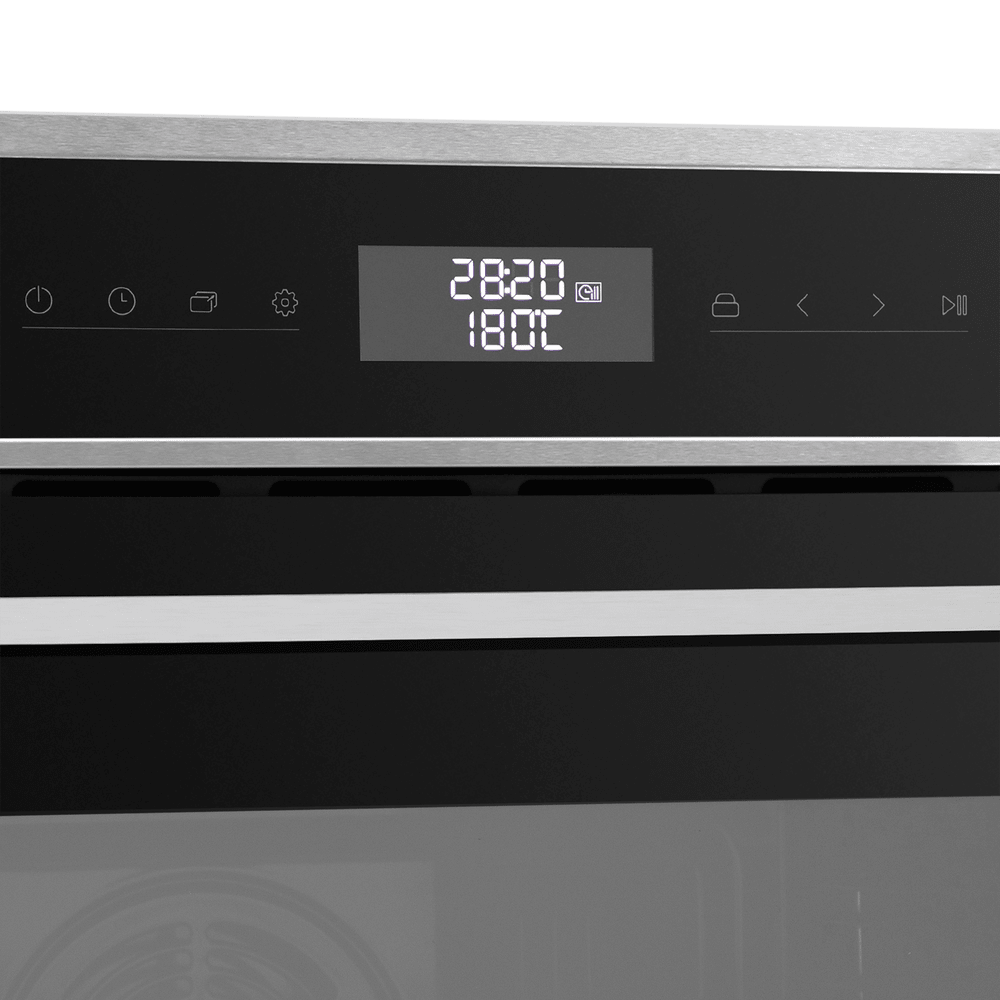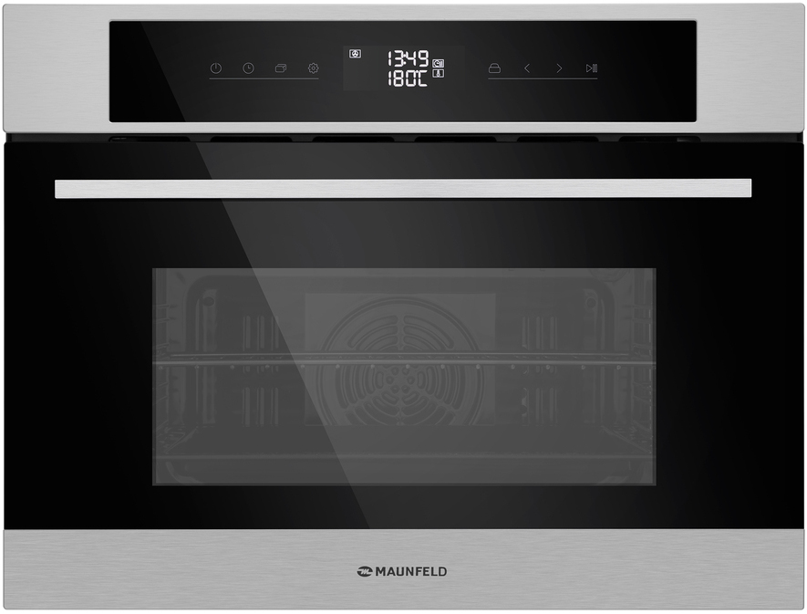 MAUNFELD AMCO458S — компактная независимая электрическая духовка с фасадом из нержавеющей стали. Удобная ручка-рейлинг также выполнена из стали, сенсорные кнопки и встроенный дисплей читаются ясно, а откидная дверца с тремя стеклами темного оттенка создаёт впечатление продуманной сборки и надёжной теплоизоляции.