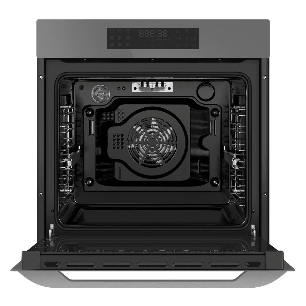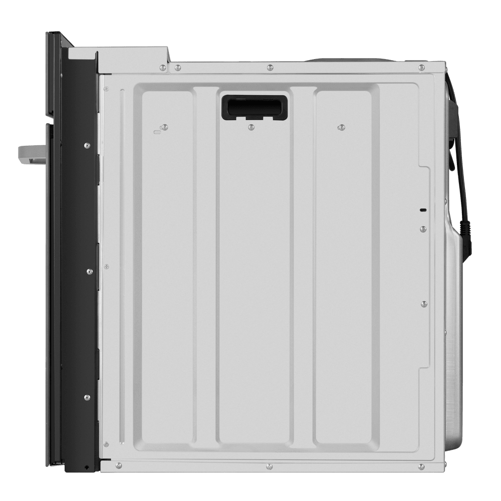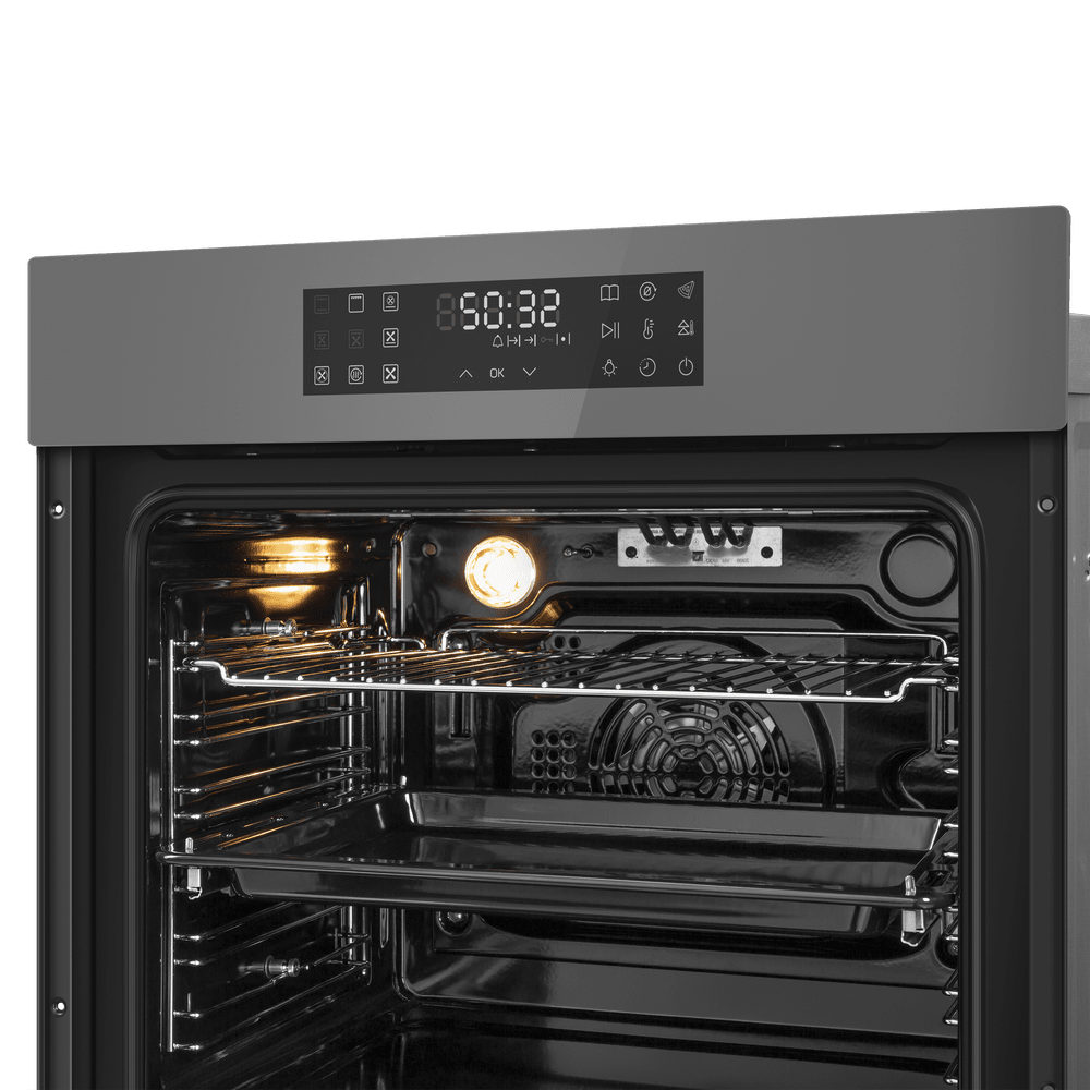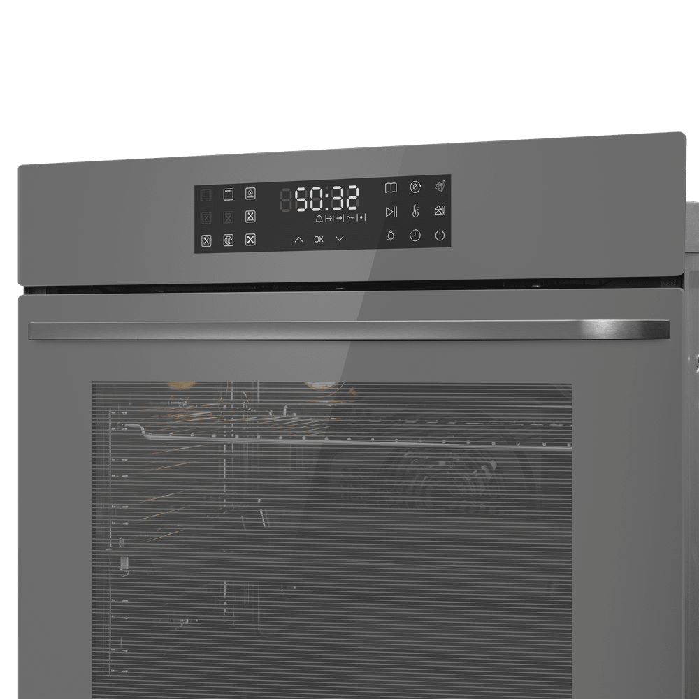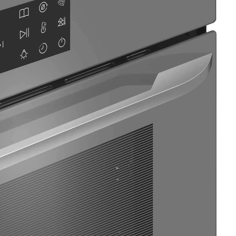 Элегантный корпус в сером цвете дополняет фурнитура из нержавеющей стали, создавая строгий, но впечатляющий образ. Откидная дверца со сложным многослойным остеклением включает три слоя и обеспечивает эффект холодной поверхности, что добавляет безопасности при использовании. Внутренняя часть покрыта эмалью лёгкой очистки, а подсветка делает контроль за приготовлением удобным и безопасным.