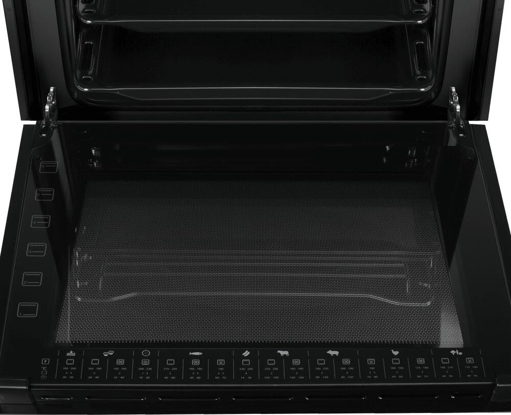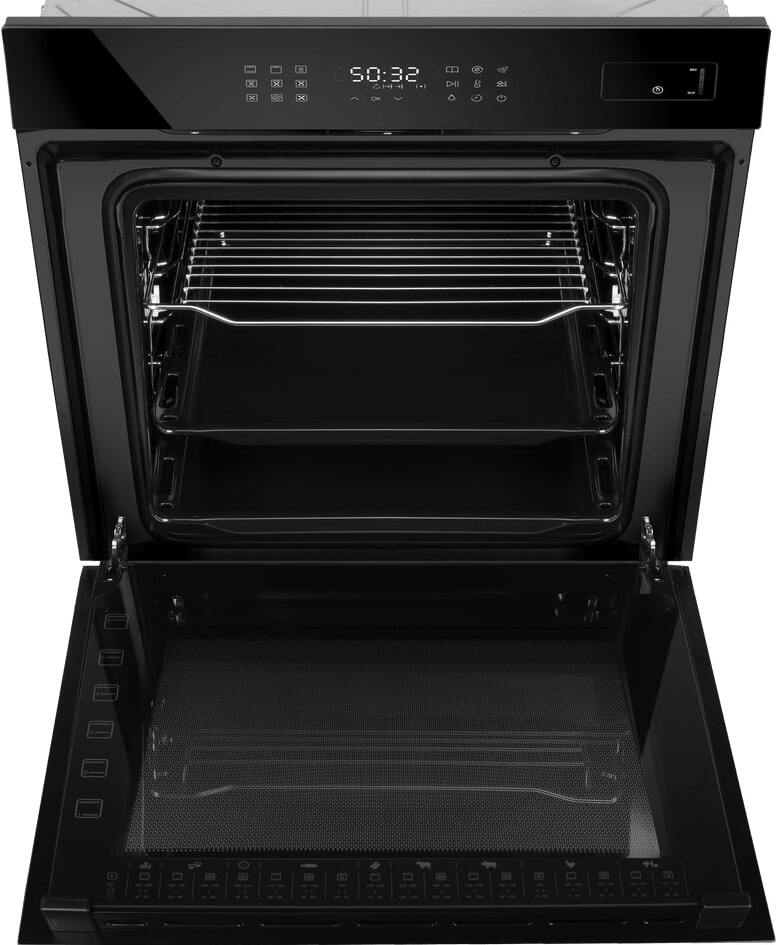 Полезный объём 76 л подходит для больших жаровен, для размещения нескольких блюд одновременно. В арсенале 10 режимов: верхний/нижний нагрев, отдельный верхний и нижний, конвекция, конвекция с нижним нагревом, пицца, интенсивное жарение, гриль и гриль с конвекцией, а также автоматический Шеф-режим. Предусмотрено 7 программ, где нужно задать только вес блюда, остальные параметры высчитываются автоматически. Максимальная температура составляет 310 °C, мощность гриля — 1.1 кВт. Сенсорное управление и сенсорный программатор с дисплеем, часами и таймером позволяют точно задавать параметры и отслеживать время.