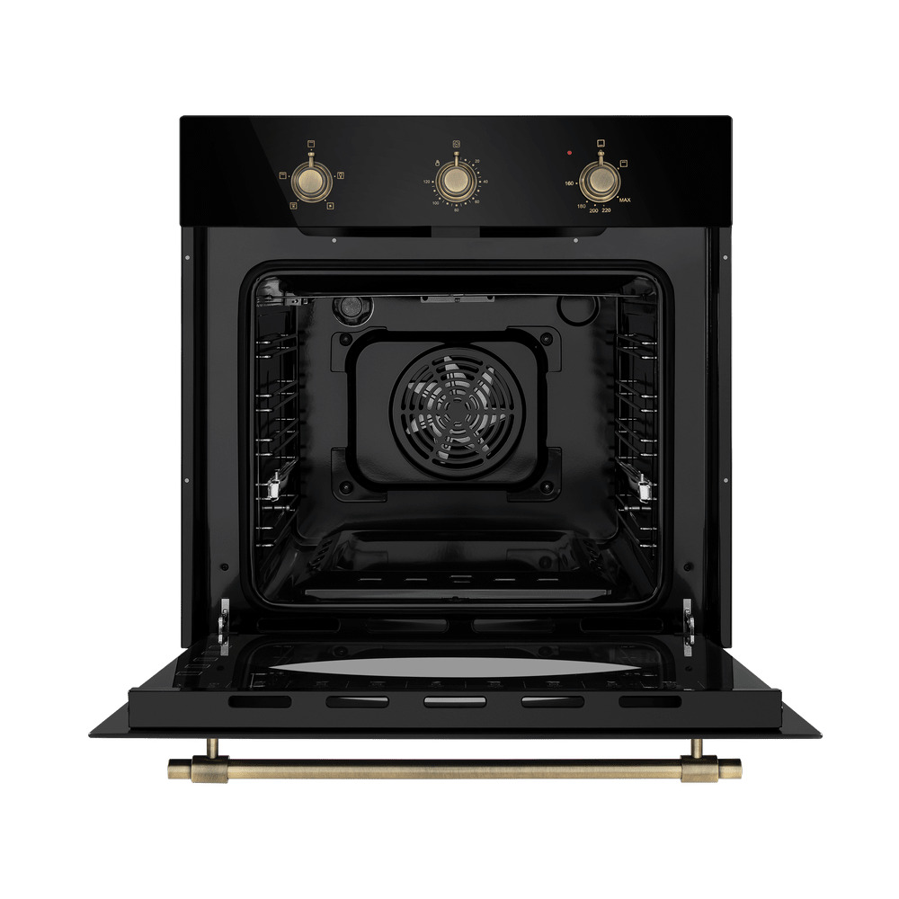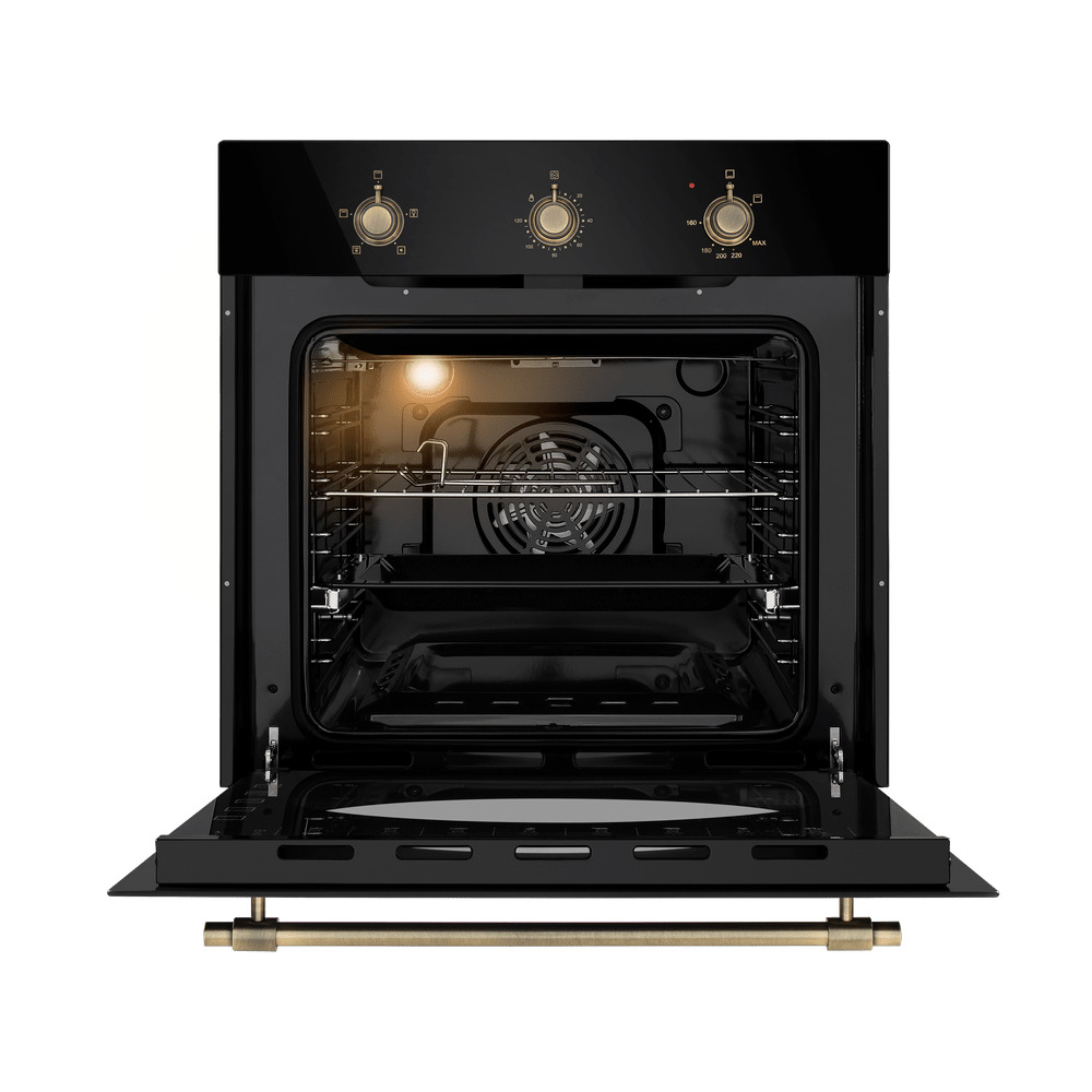 Глубина духовых шкафов, в отличие от их высоты и ширины, не отличается разнообразием. Стандартное значение составляет 54-55 см, что позволяет встраивать устройство в обычную кухонную тумбу или колонну глубиной 60 см так, чтобы оставалось достаточно места до задней стенки мебели или стены кухни для обеспечения нормальной вентиляции. В инструкциях по установке указывается, что это расстояние должно составить не менее 4–5 см. Объем такой духовки может быть равен от 50 до 70 литров.