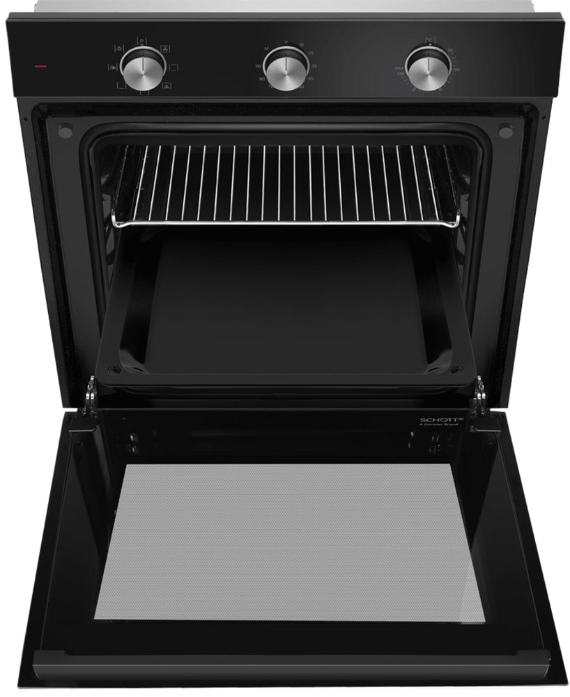 Управление интуитивное: механические рукоятки задают режим и температуру без лишней прокрутки по меню. Таймер напоминает о готовности, а в конце цикла прибор сам завершит работу — удобно, когда нужно отвлечься. Система вентиляции с тангенциальным охлаждением отводит горячий воздух из контура, снижая нагрев фронта и соседних фасадов. Камера покрыта эмалью легкой очистки: свежие следы удаляются без усилий, формат обслуживания — традиционный, без специальных расходников. В комплект вложены решетка и противень; дополнительно предусмотрен глубокий поддон для объемных блюд. Энергоэффективность класса A помогает расходовать электричество умеренно. Темная палитра уверенно сочетается и с светлыми фасадами, и с поверхностями в тон.