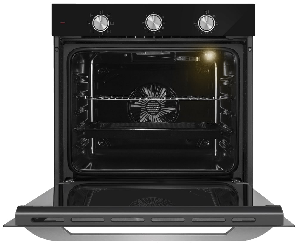 Независимая электрическая духовка хорошо смотрится в кухне благодаря темной фронтальной панели и небольшим металлическим акцентам. Ровные пропорции корпуса (59.5×59.5×57 см) позволяют встраивать прибор в подготовленную нишу 59.5×56.8×55.5 см без зазоров и сложных подгонок. Лицевая часть лаконична: утапливаемые поворотные регуляторы исчезают заподлицо, не цепляются за рукав и упрощают уборку. Откидная дверца открывается мягким движением, а трехслойное остекление удерживает жар внутри камеры. Ручка из нержавеющей стали надежна и визуально уравновешивает темный фасад.