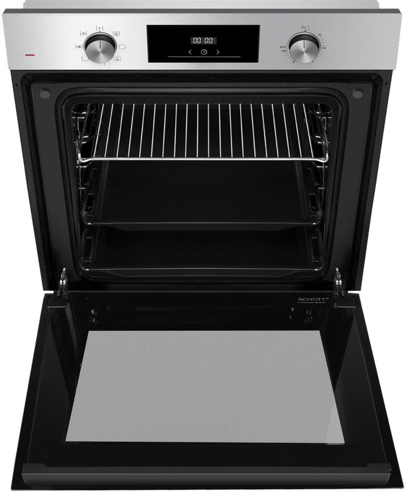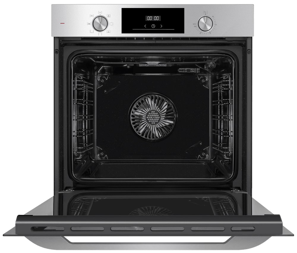 Фасад в оттенке нержавеющей стали выглядит сдержанно и стильно, легко сочетается с металлом, камнем и натуральным деревом. Панель с сенсорными клавишами и утапливаемыми регуляторами смотрится лаконично, а тройное стекло в откидной дверце образует прочный, визуально цельный фронт. Это независимый электрический встраиваемый шкаф стандартного формата: 59.5×59.5×57 см. Заявленные размеры ниши 59.5×56.8×55.5 см позволяют без подгонки поставить прибор в типовой модуль гарнитура, не привязываясь к варочной панели.
