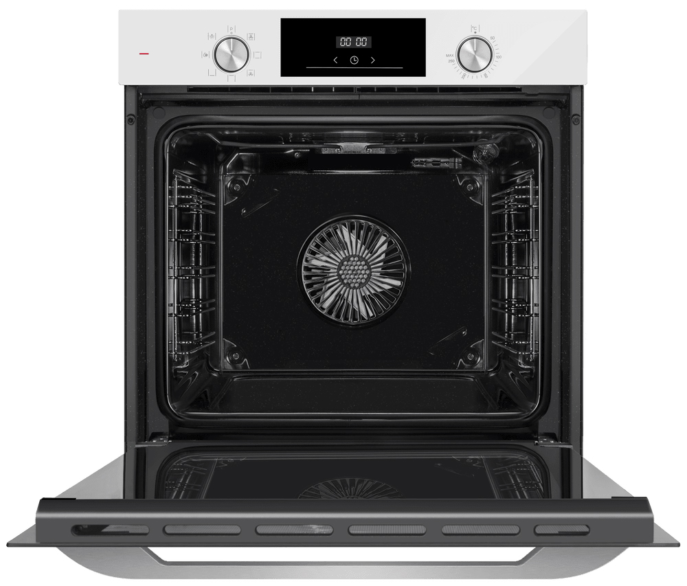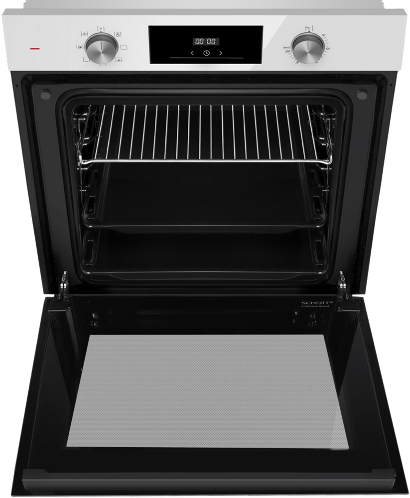 Особенности дизайна и внешней панели управления — также важный пункт при выборе духовки на кухню. В данной модели нужно обратить внимание на цвет — белый,