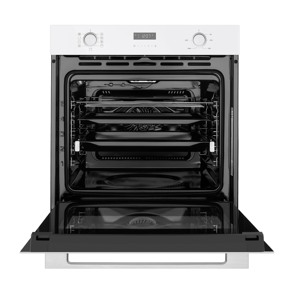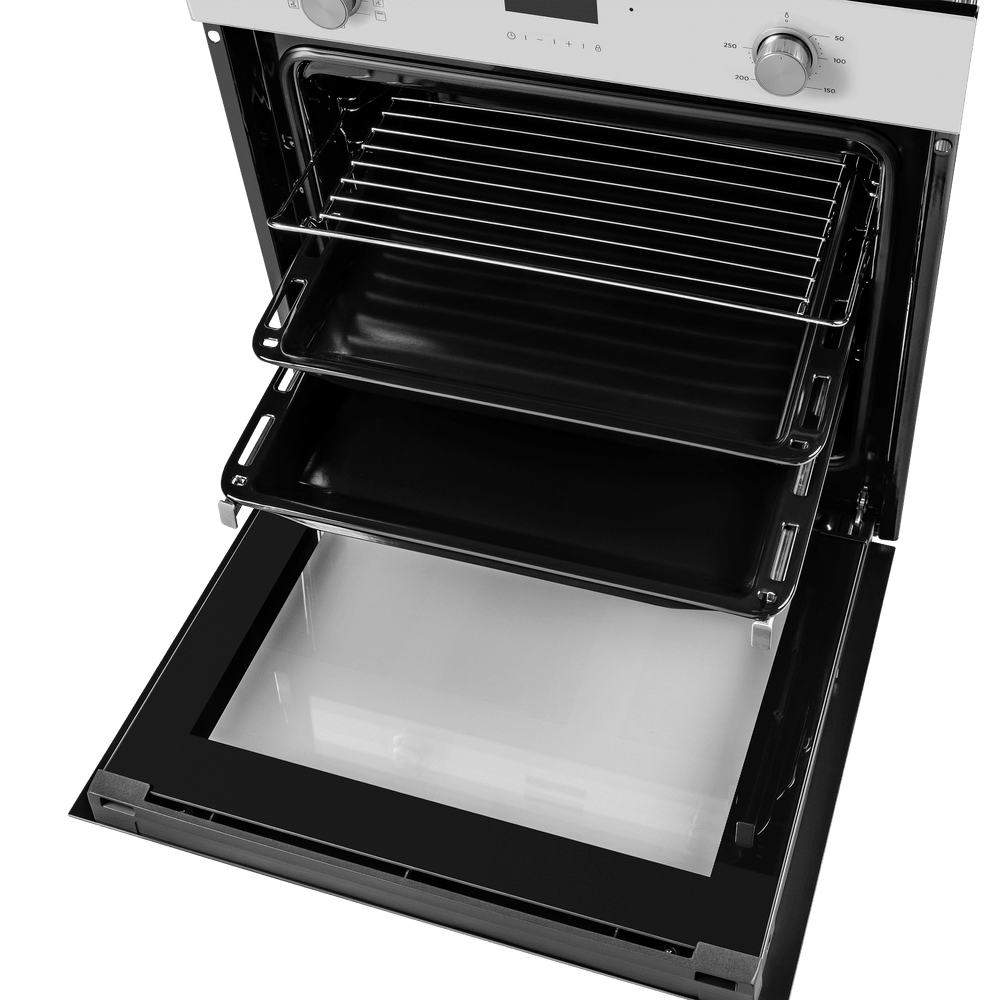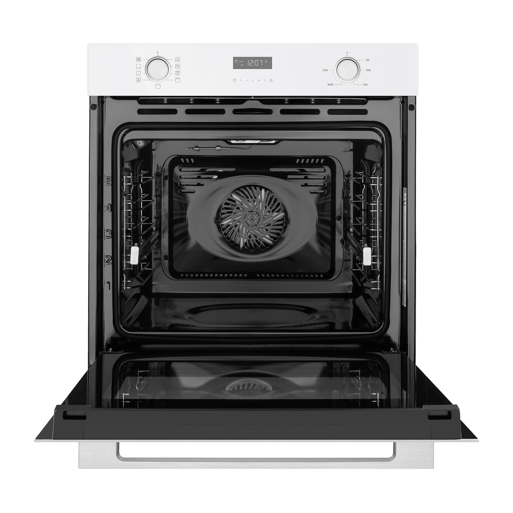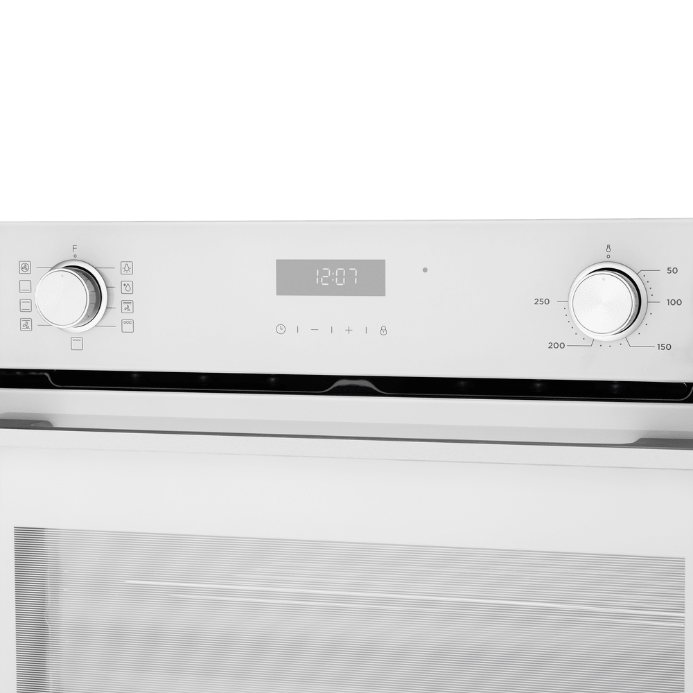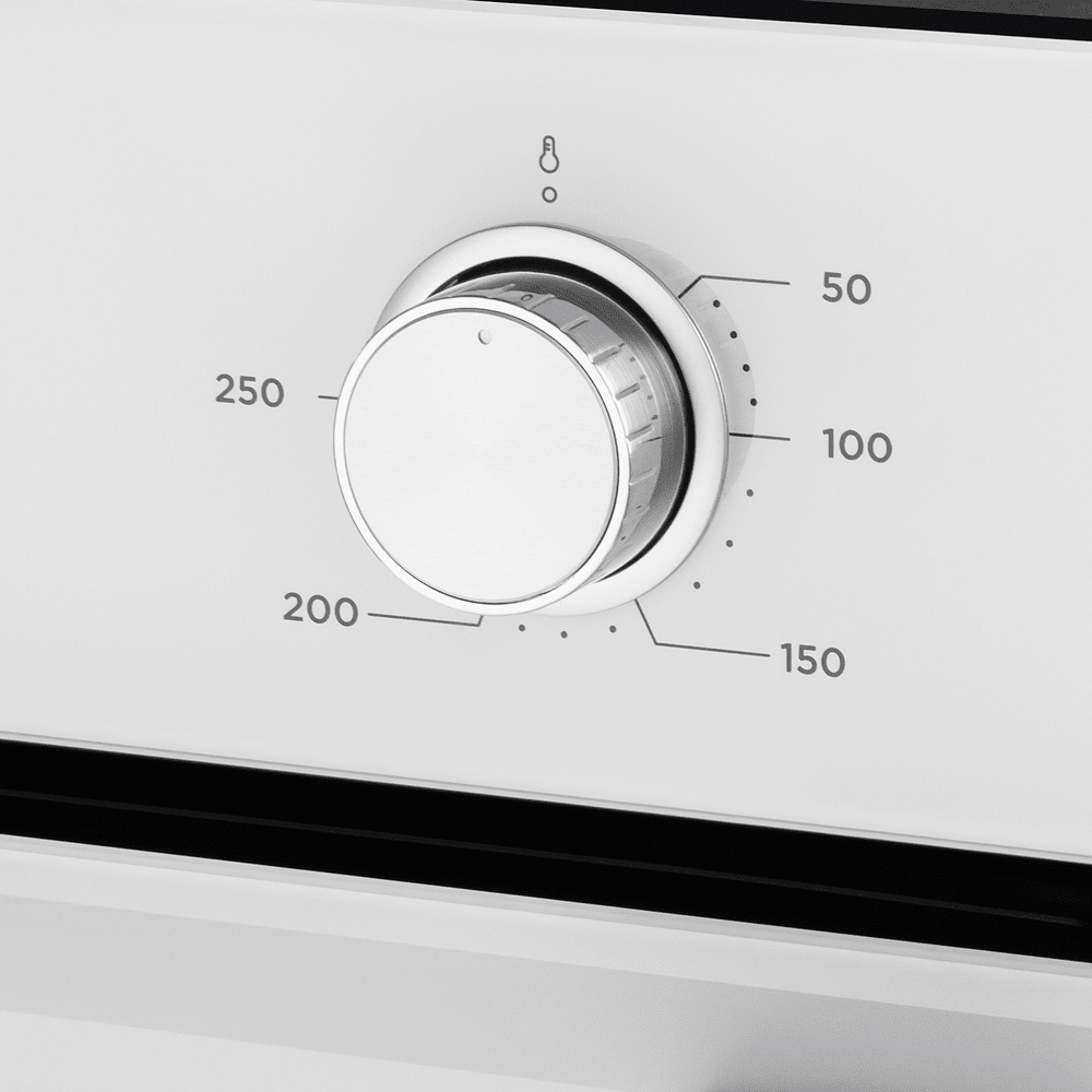 Особенности дизайна и внешней панели управления — также важный пункт при выборе духовки на кухню. В данной модели нужно обратить внимание на цвет — белый, охлаждение двери, чтобы поверхность и мебель вокруг не нагревались.