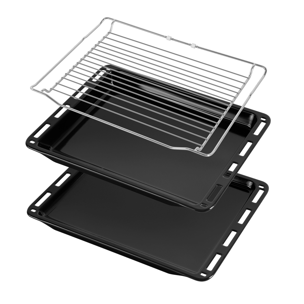 В стандартную комплектацию любого духового шкафа входят один или два противня — эмалированных или с антипригарным покрытием — и решетка. Единственный противень, как правило, имеет низкие бортики и предназначается для приготовления выпечки. Если духовка комплектуется двумя противнями, то второй отличается более высокими бортиками — его можно использовать для запекания мяса, птицы, овощных блюд. На решетке в духовке, не оснащенной грилем, обычно устанавливаются формы для запекания — стальные, керамические или стеклянные. В духовках премиум-класса количество противней может быть увеличено: к стандартному комплекту добавляются противни с перфорацией для мяса, специальные поддоны для сбора выделившегося сока.