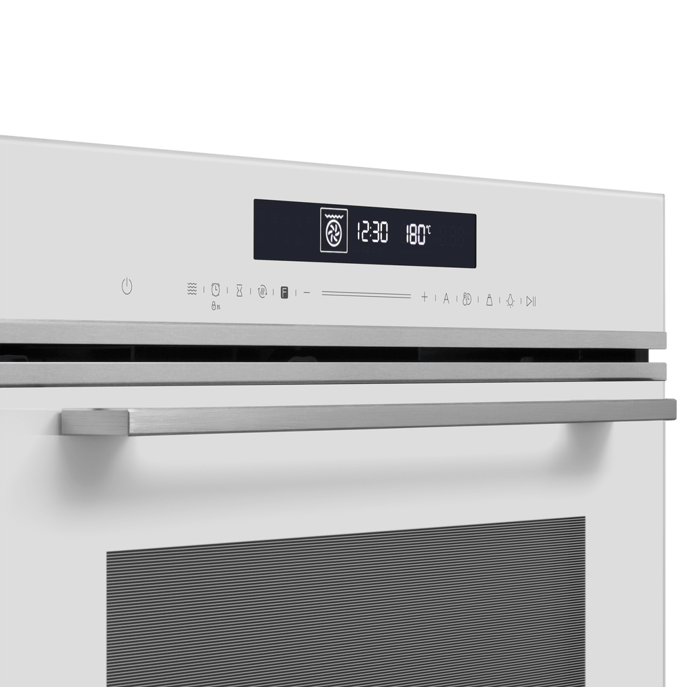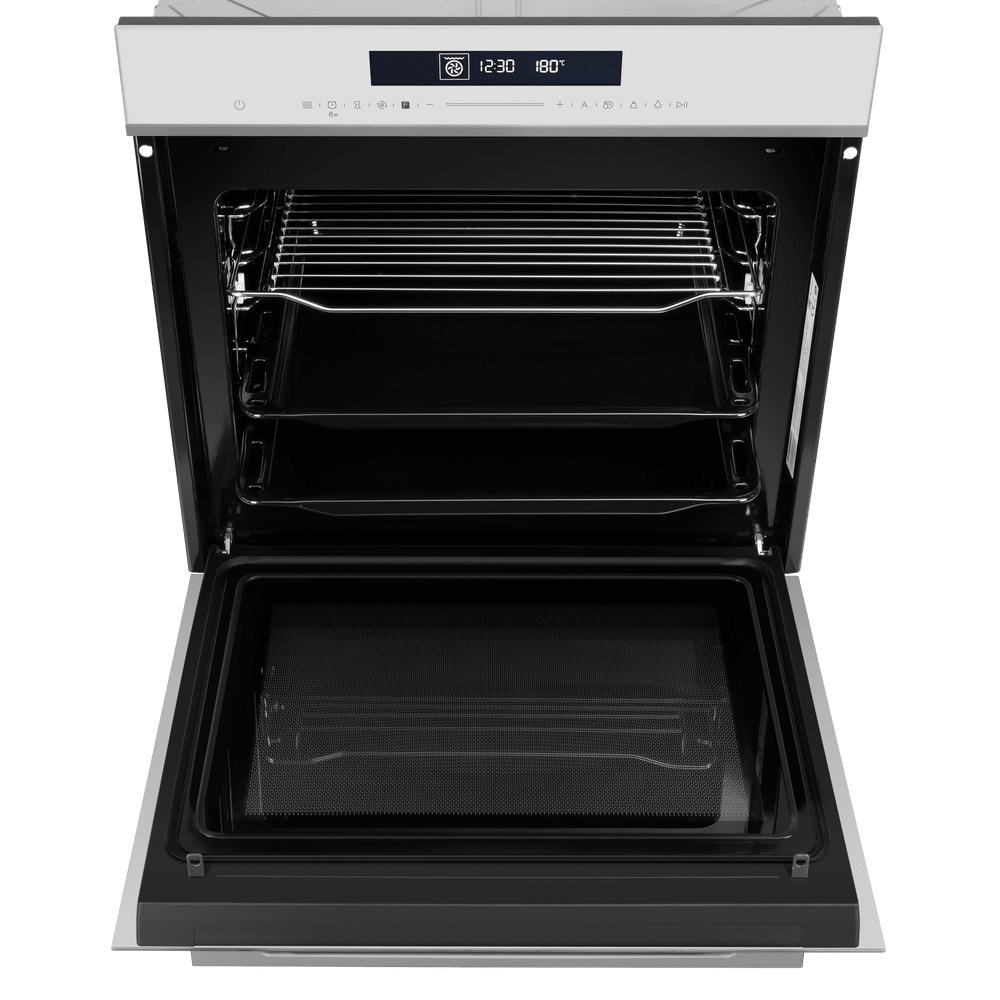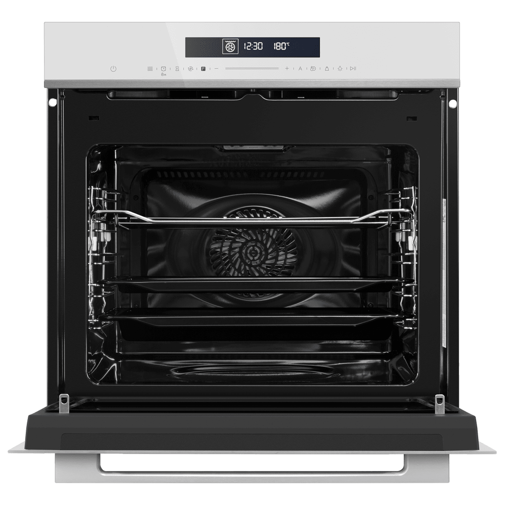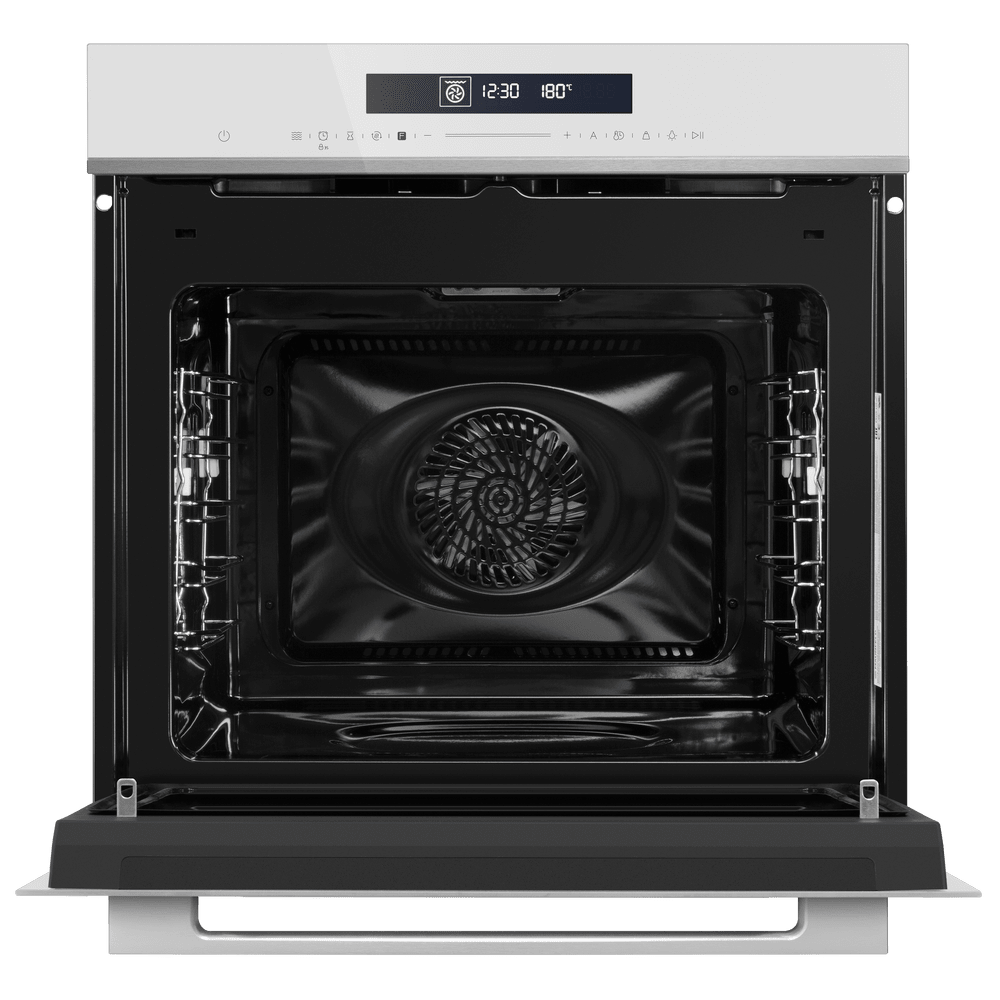 Особенности дизайна и внешней панели управления — также важный пункт при выборе духовки на кухню. В данной модели нужно обратить внимание на цвет — белый, охлаждение двери, чтобы поверхность и мебель вокруг не нагревались.
