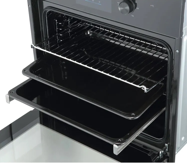 Уровни приготовления — это держатели для противней и решеток, расположенные по бокам камеры. В стандартном шкафу их обычно 4-5, в некоторых моделях доходит до 7 и больше. Для многих блюд имеет значение, на каком уровне их готовить, так как распределение жара происходит по-разному сверху, снизу или посередине. Для выдвижения и переставления противней на этих уровнях есть разного вида направляющие.