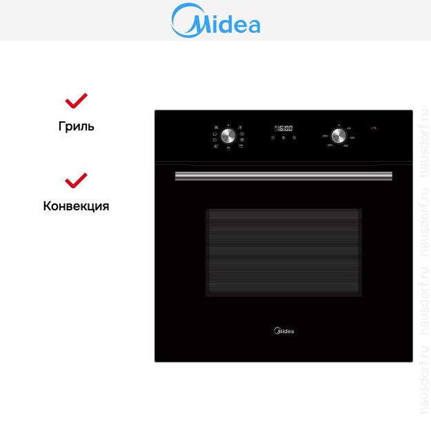 Количество режимов работы в духовом шкафу Мидеа: 9. В число доступных программ входят: классический нагрев, нижний нагрев, конвекция, гриль для создания хрустящей корочки, и другие. Тип гриля в этой модели — электрический.