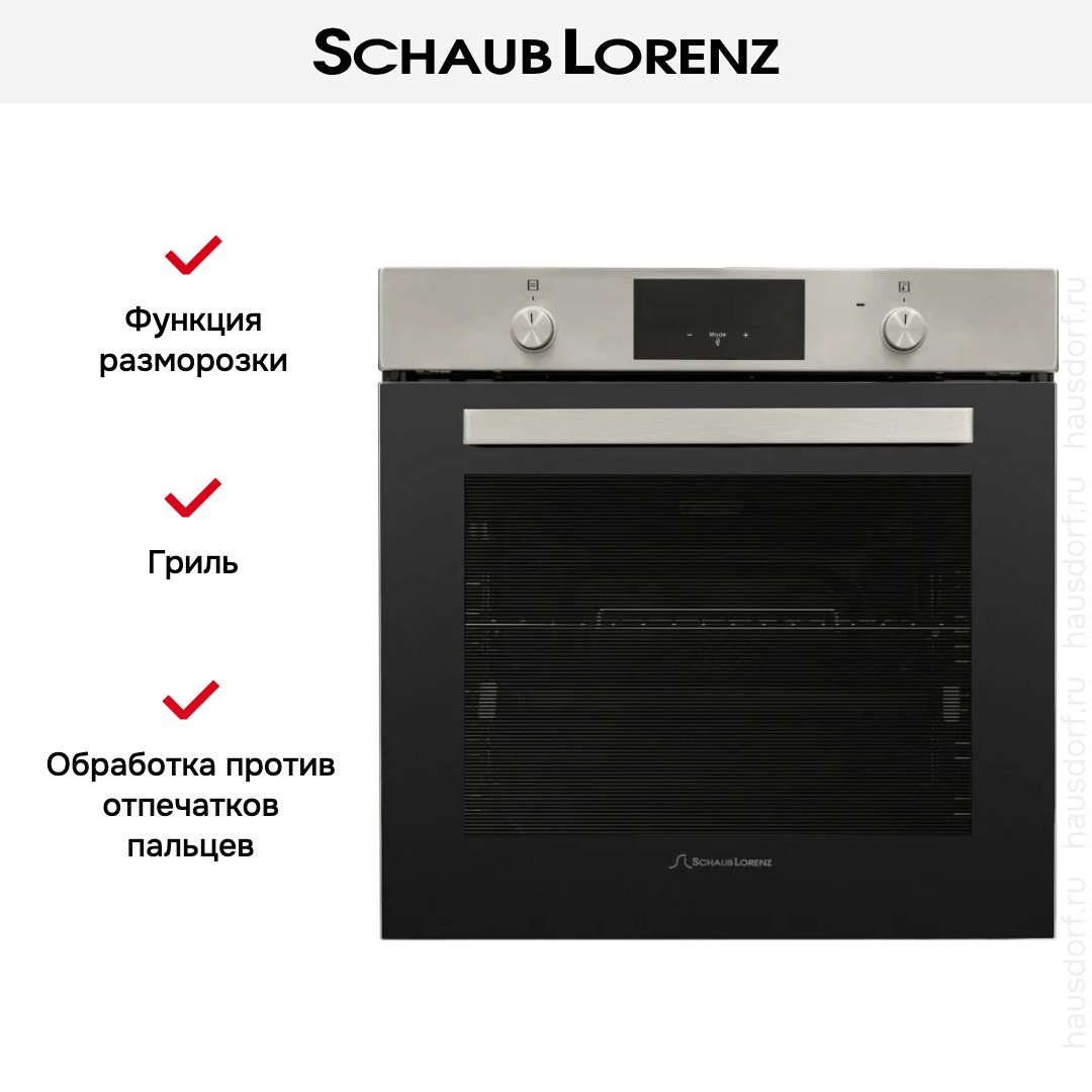 Духовой шкаф Schaub Lorenz SLB-EE6933 — независимая электрическая встраиваемая модель, созданная для тех, кто ценит сочетание эргономичного дизайна и практичности. Устройство имеет аккуратные габариты 59.5×59.5×57.5 см и подходит для ниши 60×56—58×55.5 см, что упрощает интеграцию в готовую кухонную мебель. Фасад с обработкой против отпечатков пальцев сохраняет привлекательный вид без лишних усилий. Дверца с двумя стеклами оснащена доводчиком, поэтому открывается плавно и безопасно.