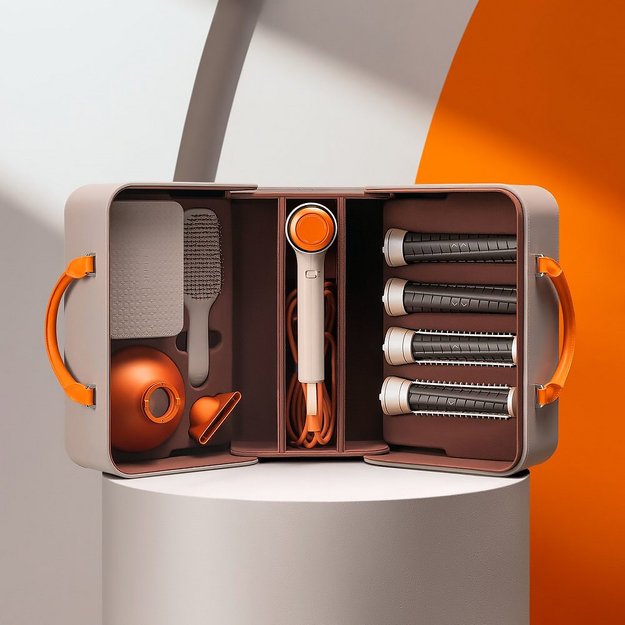 Модель представлена в удобном кейсе вместе с набором аксессуаров. Цилиндрические насадки разного диаметра позволяют создать идеальные локоны и прикорневой объем, концентратор помогает высушить, завить или выпрямить пряди. Комплект дополняют расческа, органайзер и диффузор для вьющихся волос.