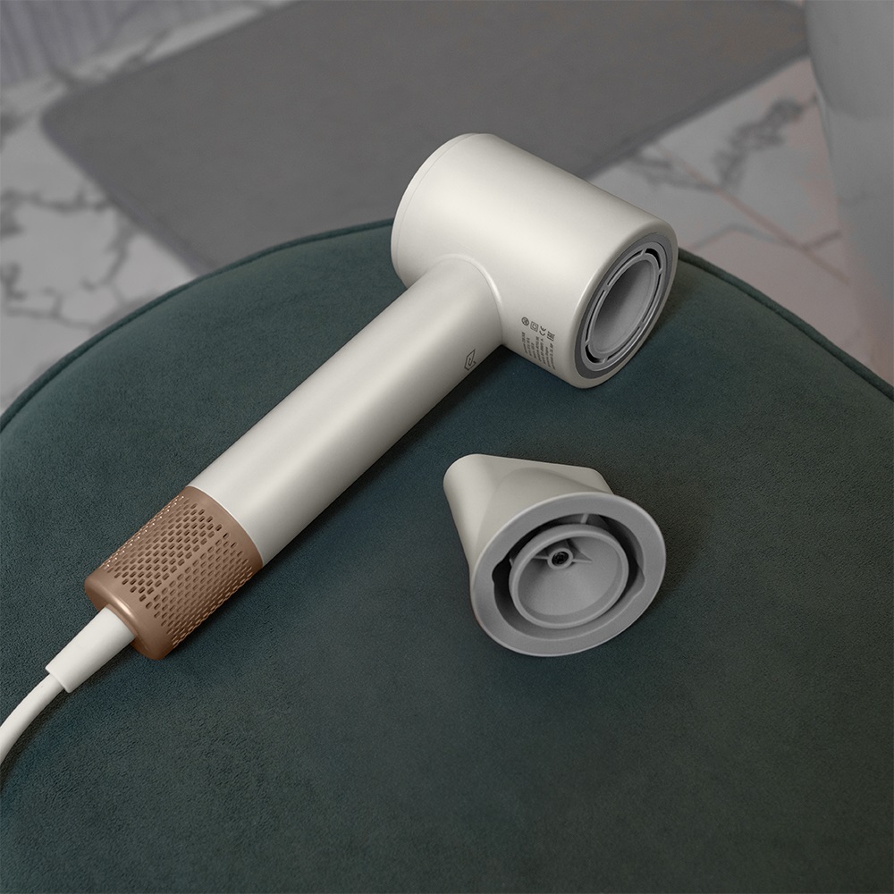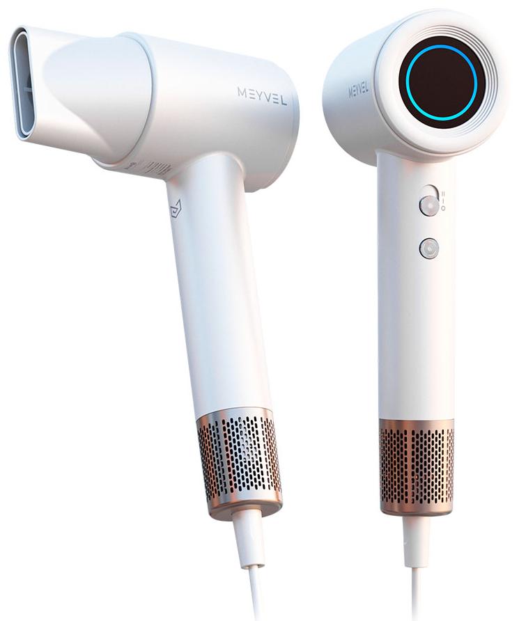 Белый фен Meyvel — стильное решение для дома, гостиниц и отелей. Мощность 1600 Вт, два температурных режима (55 °C и 85 °C), функция холодного обдува и ионизация обеспечивают бережную и эффективную сушку всех типов волос. Устройство оснащено микротермическим датчиком защиты от перегрева, съемной магнитной насадкой и фильтром из нержавеющей стали. Уровень шума — менее 60 дБ.