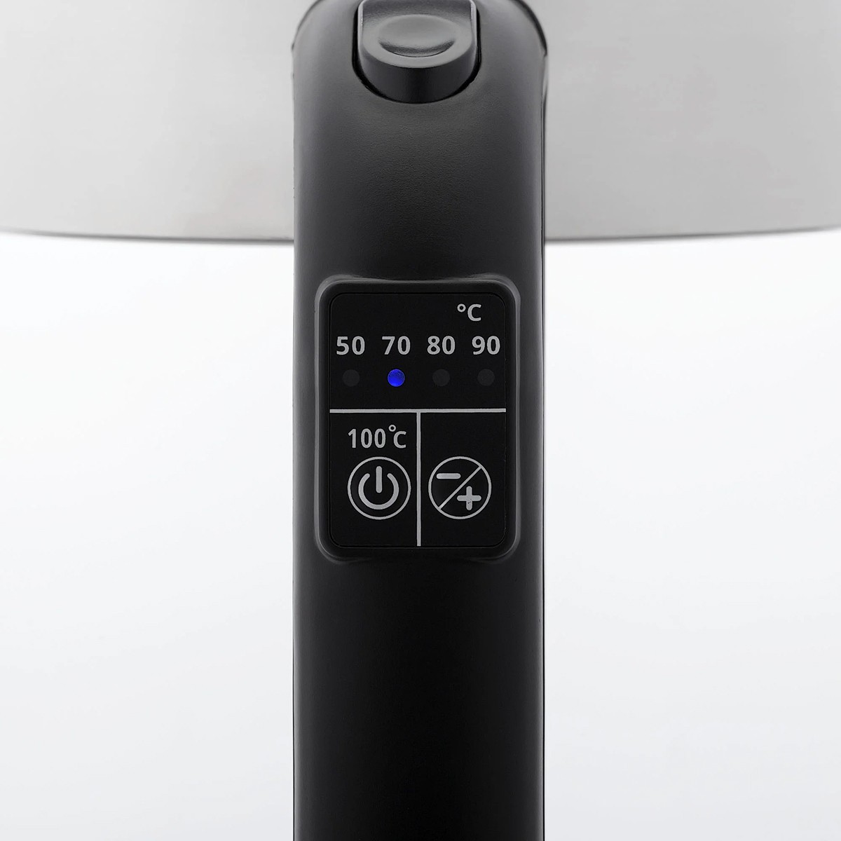 Чайник KRONA Digitaler Glas Licht КА-00008506 — изысканное сочетание передовых технологий, эстетики и функциональности, созданное для тех, кто ценит визуальную гармонию и точность в приготовлении напитков. Эта модель выделяется стильной стеклянной колбой, которая не только подчёркивает современный дизайн, но и позволяет наблюдать за процессом нагрева воды, добавляя элемент уюта и контроля. Вместимость устройства составляет 1,7 литра — оптимальный объём для повседневного использования как в домашних условиях, так и в офисе. Мощность в 2200 Вт обеспечивает быстрый нагрев до заданной температуры, экономя время без ущерба для качества. В основе конструкции — закрытый нагревательный элемент, расположенный в основании, что гарантирует равномерное распределение тепла, снижает риск образования накипи и упрощает уход за внутренней поверхностью. Колба выполнена из термостойкого стекла, устойчивого к перепадам температур и не влияющего на вкус воды, а чёрное оформление придаёт прибору лаконичную элегантность, гармонично вписываясь в интерьеры от минимализма до индустриального стиля. Особенностью модели является встроенная подсветка, которая мягко освещает колбу в процессе работы, создавая атмосферу уюта и одновременно сигнализируя о включённом состоянии. Цифровая панель с интуитивным управлением позволяет точно выбрать желаемую температуру — от 40 C для деликатных сортов чая до 100 C для классического кипячения. Функция поддержания тепла и автоматическое отключение по достижении нужного режима повышают комфорт и безопасность эксплуатации. Эргономичная ручка из термостойкого материала обеспечивает надёжный хват, а широкое горлышко облегчает наполнение и очистку. Прибор оснащён защитой от сухого включения, предотвращающей перегрев и продлевающей срок службы. Несмотря на наличие электроники, устройство работает тихо, не нарушая утреннюю тишину. Прозрачная колба в сочетании с чёрными акцентами создаёт визуальный контраст, подчёркивающий современный характер техники. Этот электрочайник станет идеальным выбором для гурманов, ценящих не только вкус, но и эстетику процесса заваривания. Сочетание инноваций, практичности и утончённого дизайна делает данную модель достойным приобретением для современного дома.