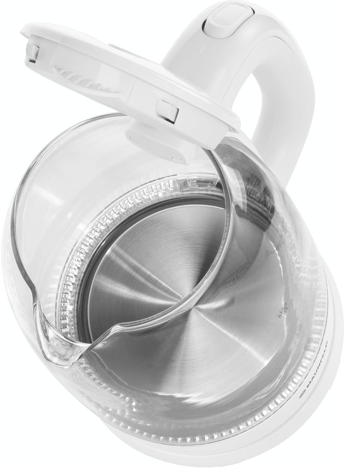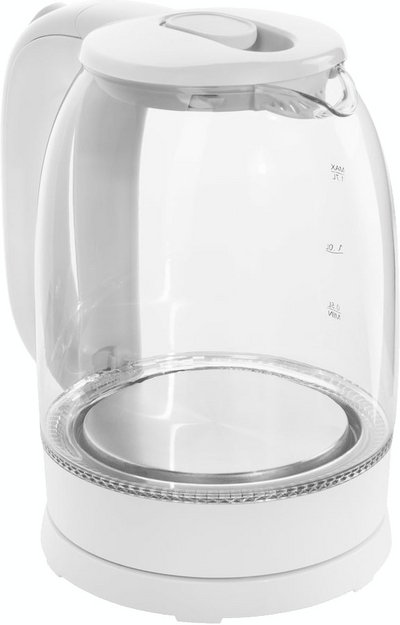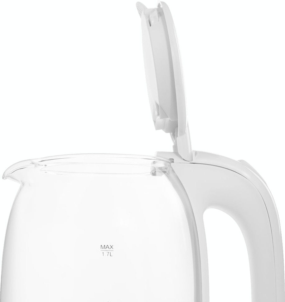 Материал корпуса: пластик/стекло. Материал подставки: пластик. Объем (л): 1.7. Цвет: белый. Мощность (Вт): 2200. Управление: механическое.