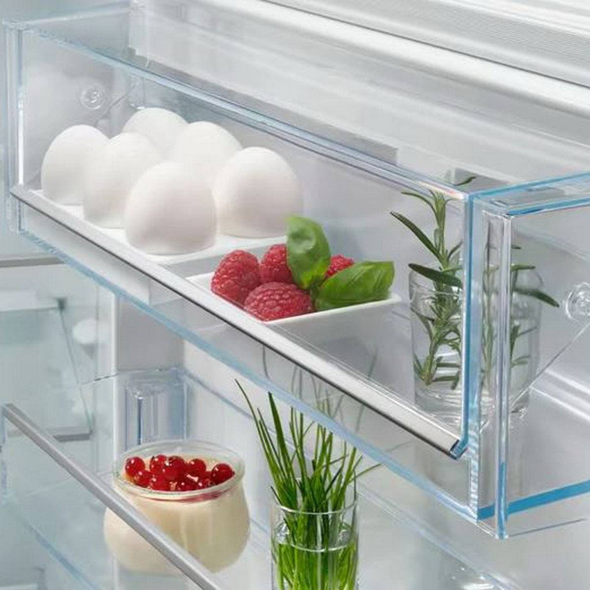 Ящики для продуктов изготавливаются либо целиком из прозрачного пластика, либо часто имеют переднюю прозрачную панель, которая обеспечивает лучший обзор. Полки в большинстве холодильников могут перемещаться по высоте, устанавливаются на специальных направляющих и без труда снимаются для очистки.