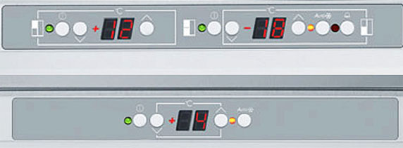 Для холодильной и морозильной камер в таких приборах имеются отдельные индикаторы, указывающие на превышение заданной температуры. Кроме того, на дисплее вместо значения температуры могут появляться символы или коды, указывающие на возникновение той или иной ошибки.