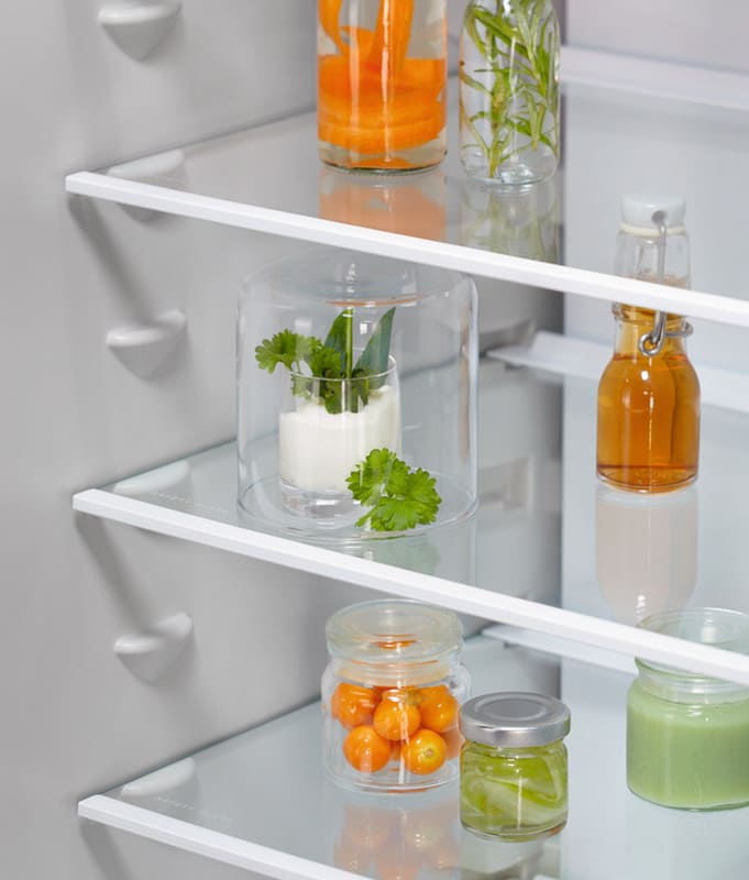 Ящики для продуктов изготавливаются либо целиком из прозрачного пластика, либо часто имеют переднюю прозрачную панель, которая обеспечивает лучший обзор. Полки в большинстве холодильников могут перемещаться по высоте, устанавливаются на специальных направляющих и без труда снимаются для очистки.