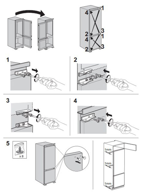Встраиваемый прибор проще разместить в комнате, даже если общий метраж не такой уж большой. Вы можете спрятать его за декоративной панелью от мебельного фасада — советуем заранее определить нишу и заказывать панели исходя из типа крепления к двери. Способ монтажа в данной модели: скользящее крепление двери (система door sliding) Вы можете поменять направление открывания двери, так как упор переставляемый и ее можно перевесить на другую сторону. Такая функция открывает больше возможностей для установки. Холодильник с морозильником обладает всеми опциями, которые чаще всего ищут и выбирают покупатели. Стандартная конфигурация — универсальный вариант для любой квартиры. Количество камер: 2.