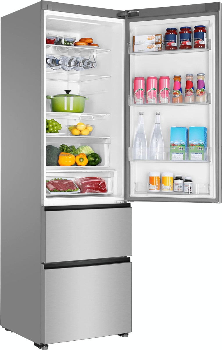 Трехкамерные модели выпускаются в нескольких вариантах. В некоторых случаях в качестве третьей камеры поступает так называемая зона свежести — отделение, где поддерживается температура около 0 градусов. В другом варианте подобные модели имеют морозильную камеру, состоящую из двух выдвижных ящиков.