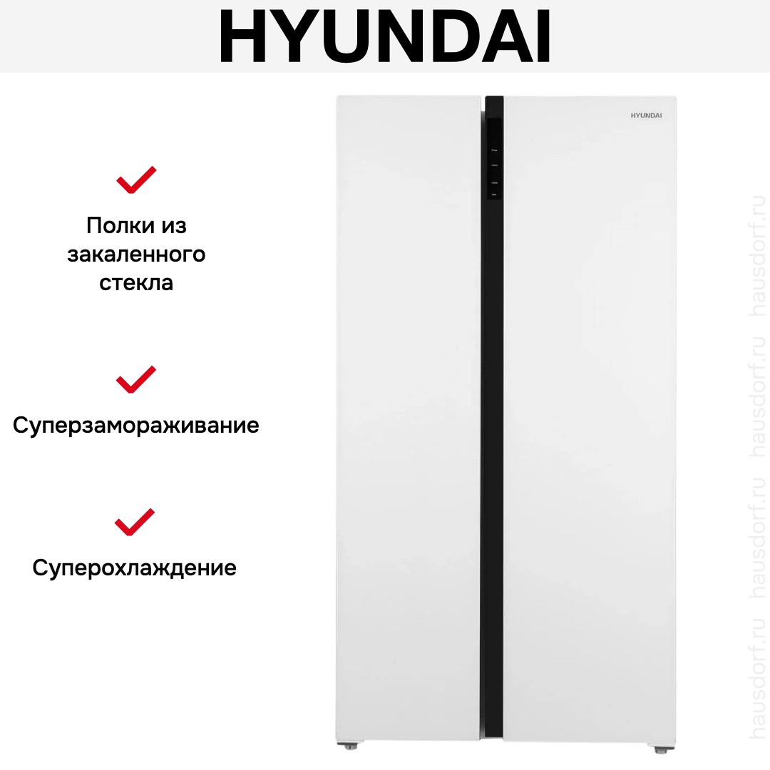 Холодильник Hyundai CS5003F сочетает в себе элегантный минимализм и продуманный функционал, готовый стать центром вашей кухни. Его белый стеклянный фронт смотрится стильно и легко очищается, а скрытая ручка поддерживает ровную, лаконичную линию фасада. При габаритах 178×91,1×63,6 см и общем объёме 537 литров прибор занимает достойное место, не перегружая интерьер благодаря тонкой глубине и аккуратному дизайну.