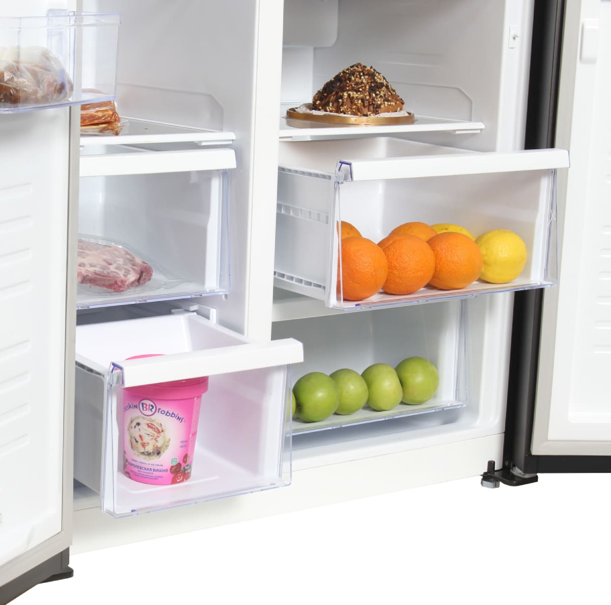 Специальная зона свежести предназначена для правильного и более длительного хранения овощей, фруктов, зелени. В ней поддерживается околонулевая температура, поэтому продукты не перемораживаются и не пересыхают.