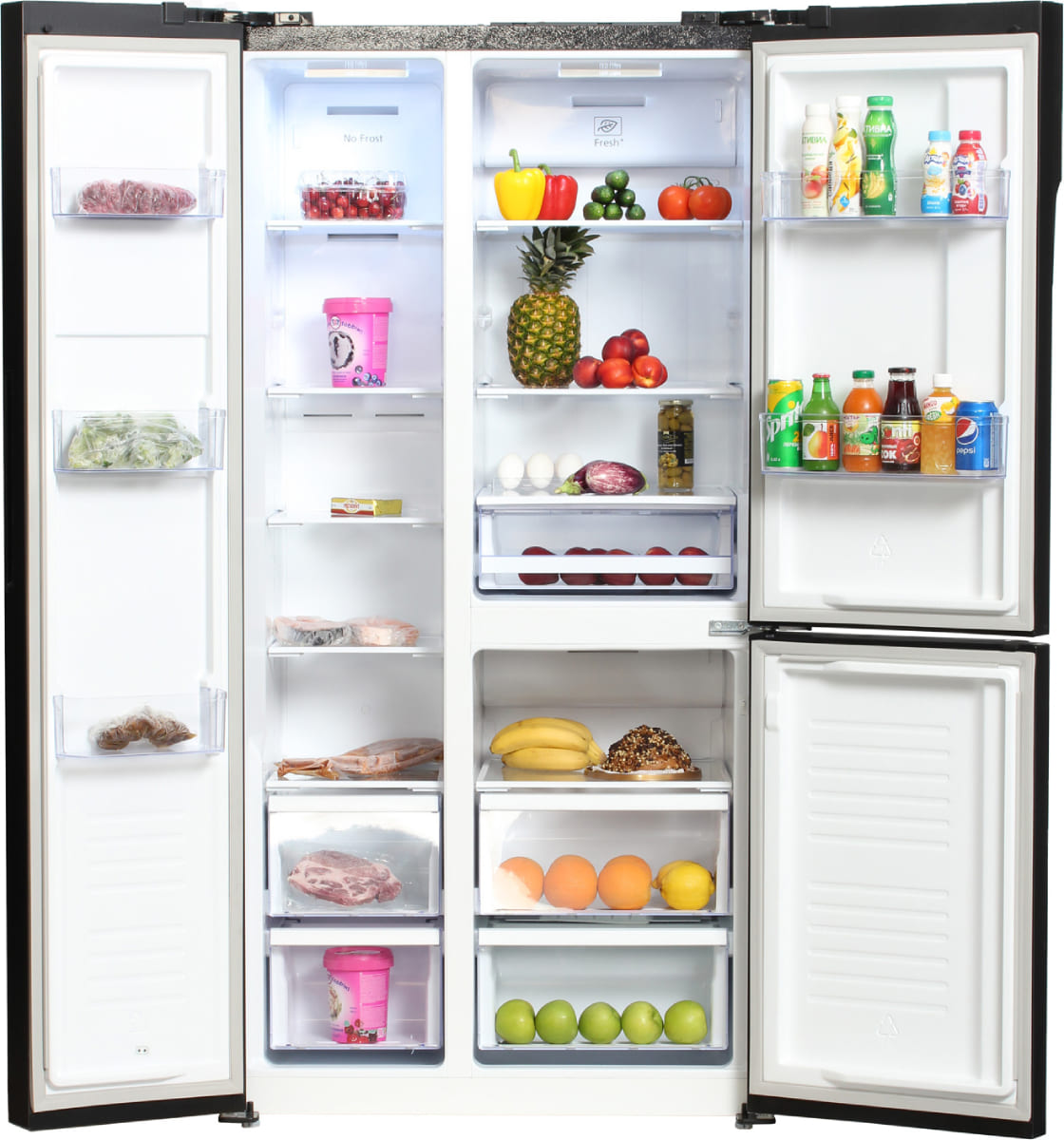Холодильники Side-by-Side, что в переводе означает «бок-о-бок», — вместительные устройства, в которых холодильная и морозильная камеры располагаются рядом друг с другом. Они предназначаются для хранения значительного запаса продуктов и иногда называются холодильниками с американским типом компоновки, поскольку такие приборы с распашными дверями появились именно в США.