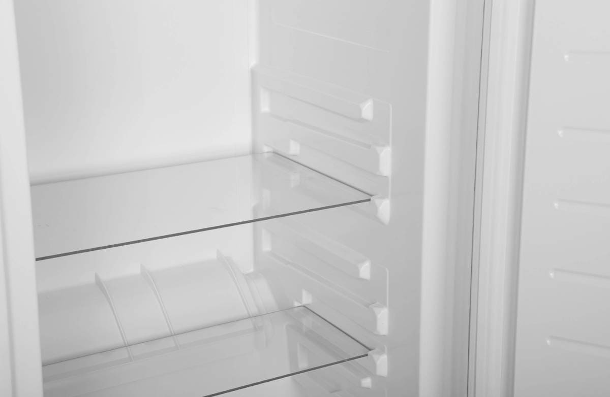 Полки в отделении бывают нескольких типов. Чаще всего встречаются полки из закаленного или ударопрочного стекла. Закаленное стекло выдерживает особенно большие нагрузки до 25 кг, так что на них можно устанавливать посуду из любого материала. Стекло является безопасным нейтральным материалом, не желтеет и не портится со временем, а также быстро и легко моется. Для того чтобы предотвратить проливание жидкости, полки оснащаются металлической или пластиковой окантовкой.