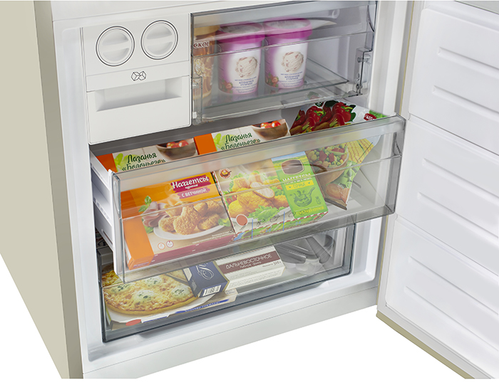 No Frost (Total No Frost, Frost Free): вентилятор обеспечивает циркуляцию охлажденного воздуха, благодаря чему лед не нарастает на стенке, а концентрируется только на скрытом внутри холодильника испарителе. Талая вода собирается в специальной емкости и испаряется. Такой холодильник не нужно размораживать – это экономит время и позволяет не останавливать прибор. Благодаря этим плюсам в современных моделях No Frost – самая распространенная система.
