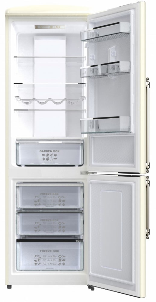 Отдельного упоминания заслуживают холодильники итальянской фирмы Smeg в ретро-стиле пятидесятых годов в округлом корпусе с выпуклой дверью. Для придания неповторимого внешнего вида фасад у них выполняется из прочного монолитного формованного термопластика.