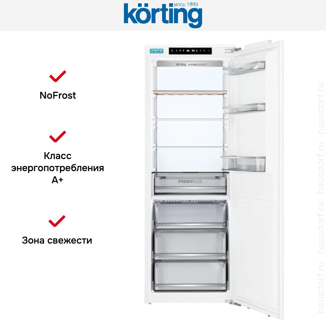 Встраиваемый холодильник Korting KSI 1935 — это вместительная и продуманная модель, разработанная для аккуратной интеграции в мебельный гарнитур. Панель под фасад сохраняет единый стиль кухни без видимых элементов техники. Параметры корпуса 193.7×69×55 см и размеры ниши для встраивания 194.2×71.2×56 см дают точное понимание требований к монтажу. Общий объем 337 литров обеспечивает достаточный запас для всех, кто любит закупаться про запас. Дверной упор справа можно перевесить, чтобы агрегат открывался в другую сторону.